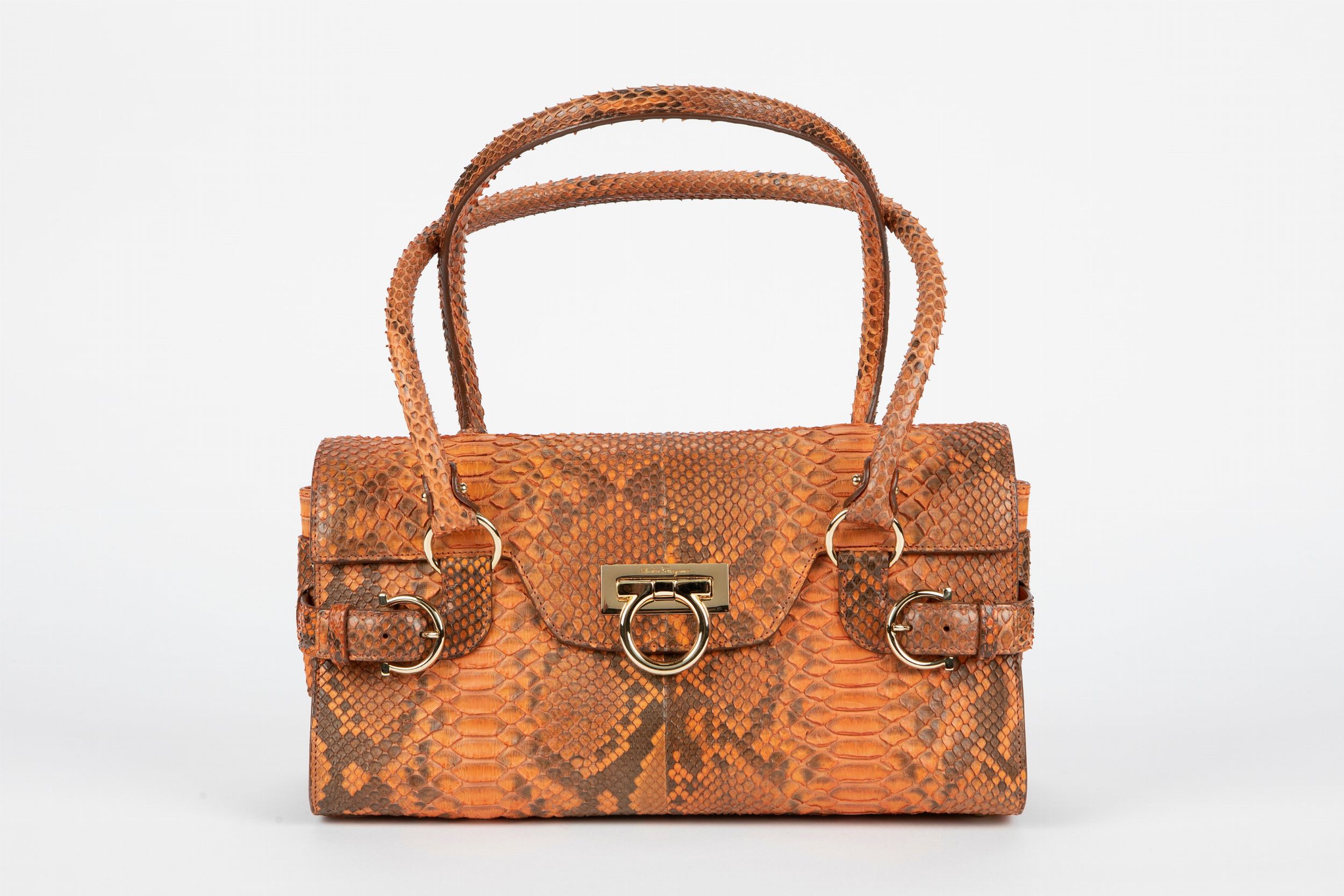 in pelle di pitone melange, color albicocca, dettagli metallo dorato, doppi manici, cm 32, con sacchetto (lievissimi difetti).
