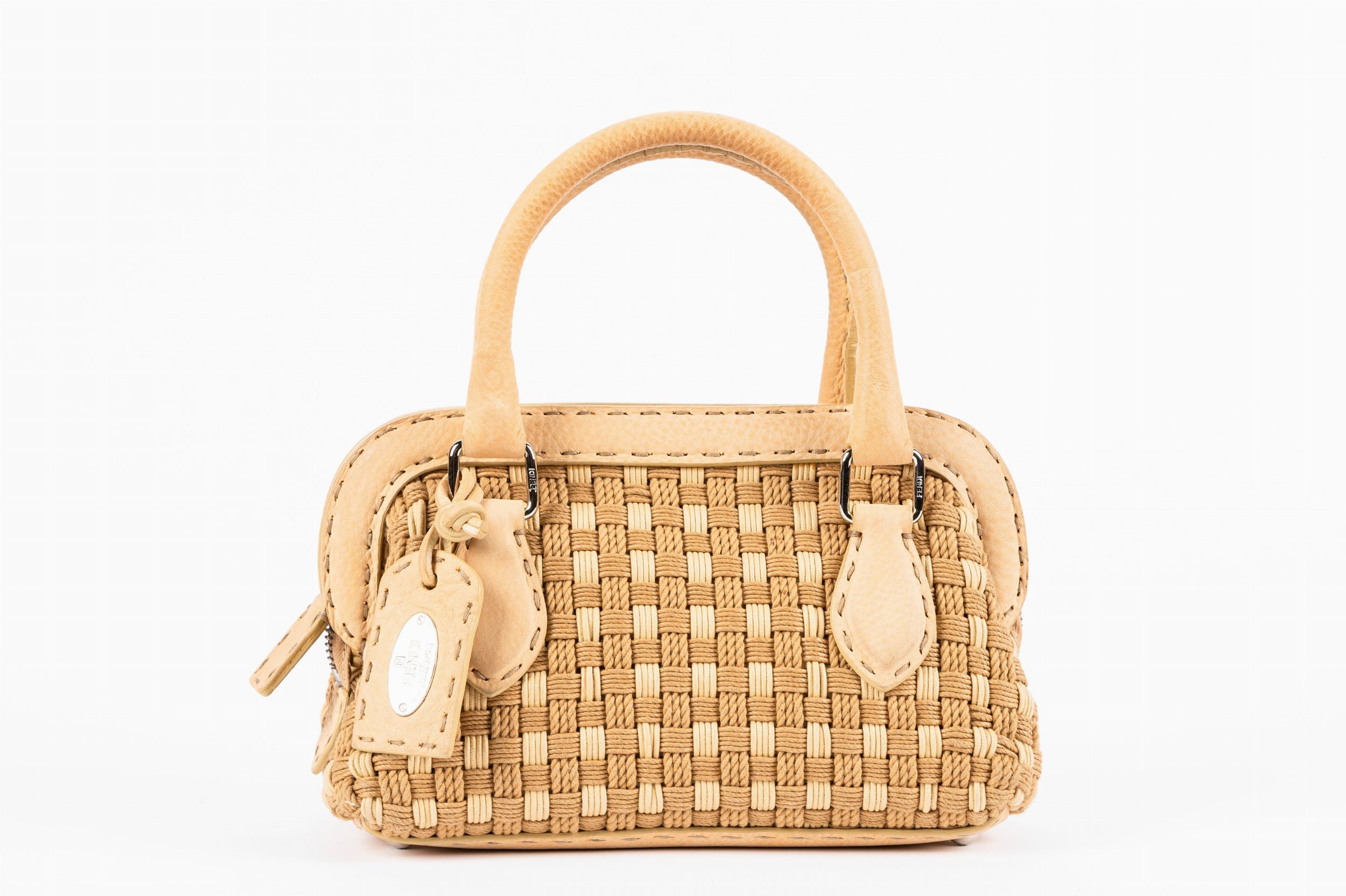 in corda intrecciata color beige, profili e manici in pelle, dettagli in metallo, cm 22 (lievi difetti)