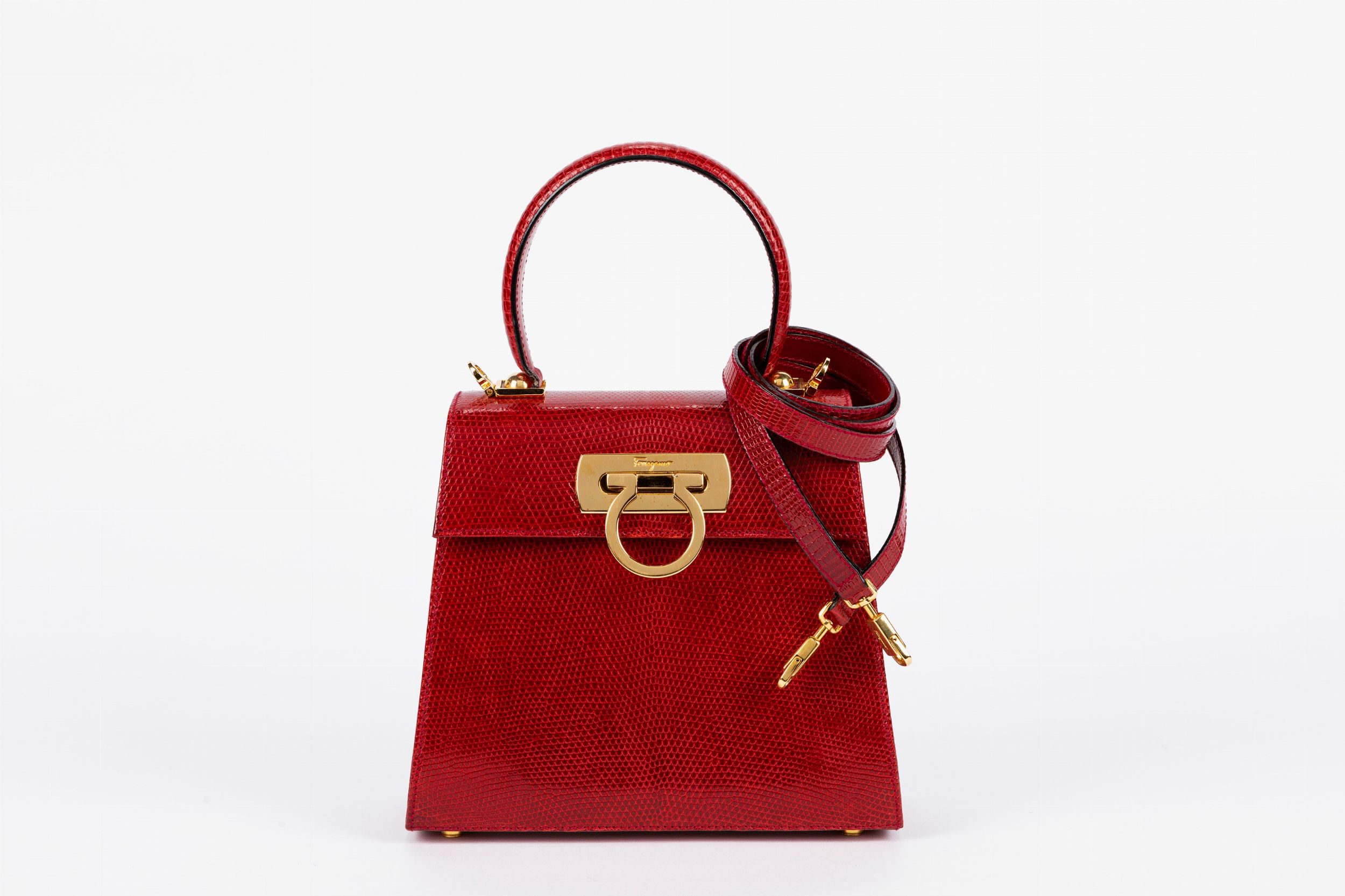 in pelle di lucertola color rubino, con tracolla staccabile, dettagli in metallo dorato, cm 20, con sacchetto.