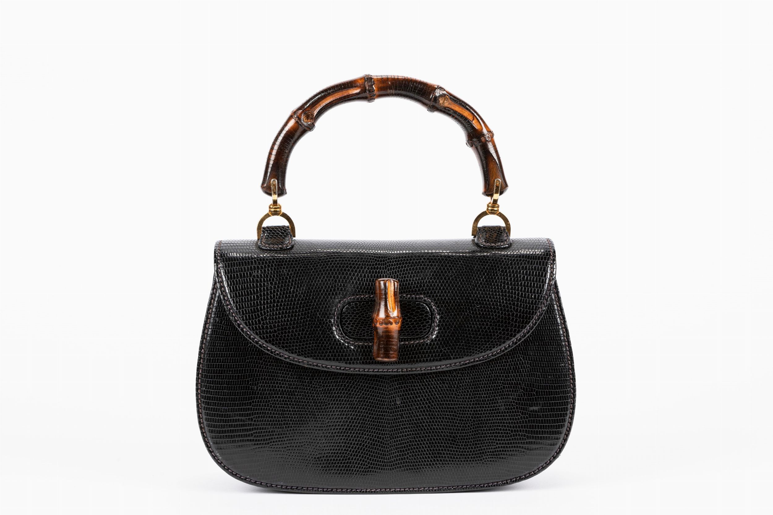 in pelle di lucertola color blu scuro, manico e chiusura in bambù, cm 27, Pre Convenzione Cites, primi anni 70 (lievi difetti)