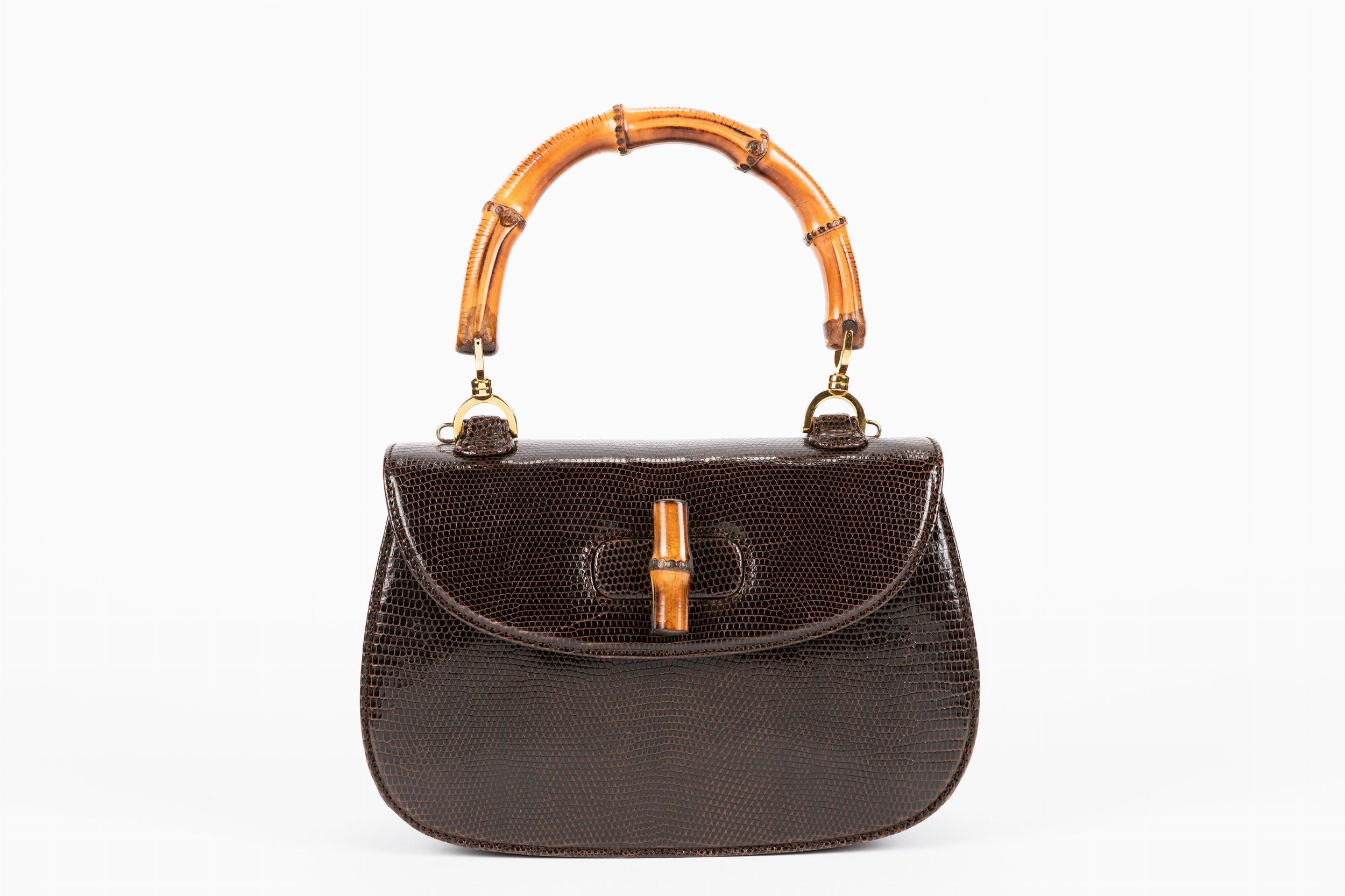 in pelle di lucertola color marrone, dettagli in metallo dorato, con tracolla, cm 26 (lievi difetti).