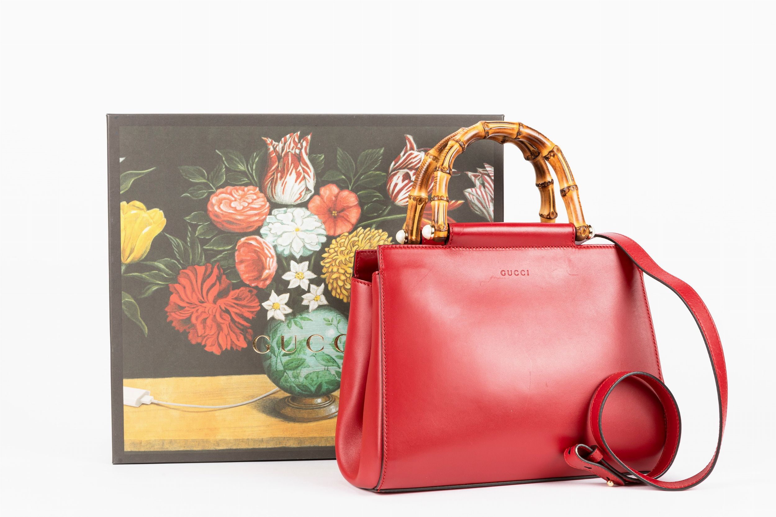 in pelle color rosso, doppi manici in bamboo, dettagli in metallo dorato e perle fancy, tracolla staccabile, cm 28, con sacchetto e scatola (lievissimi difetti)