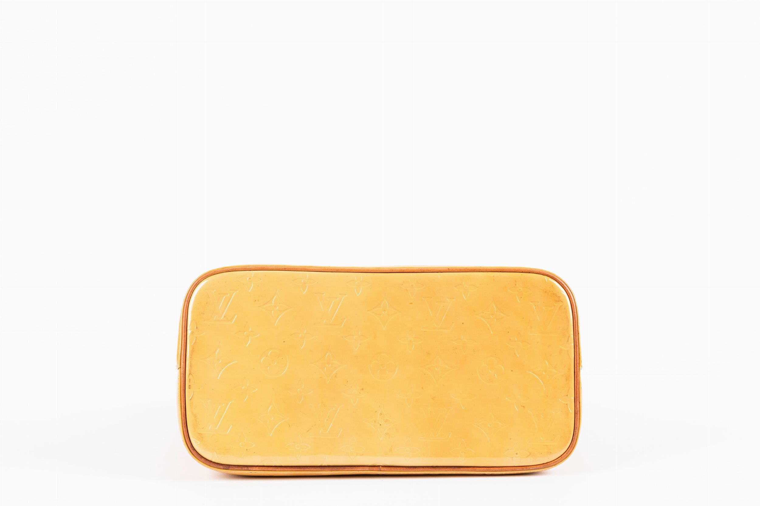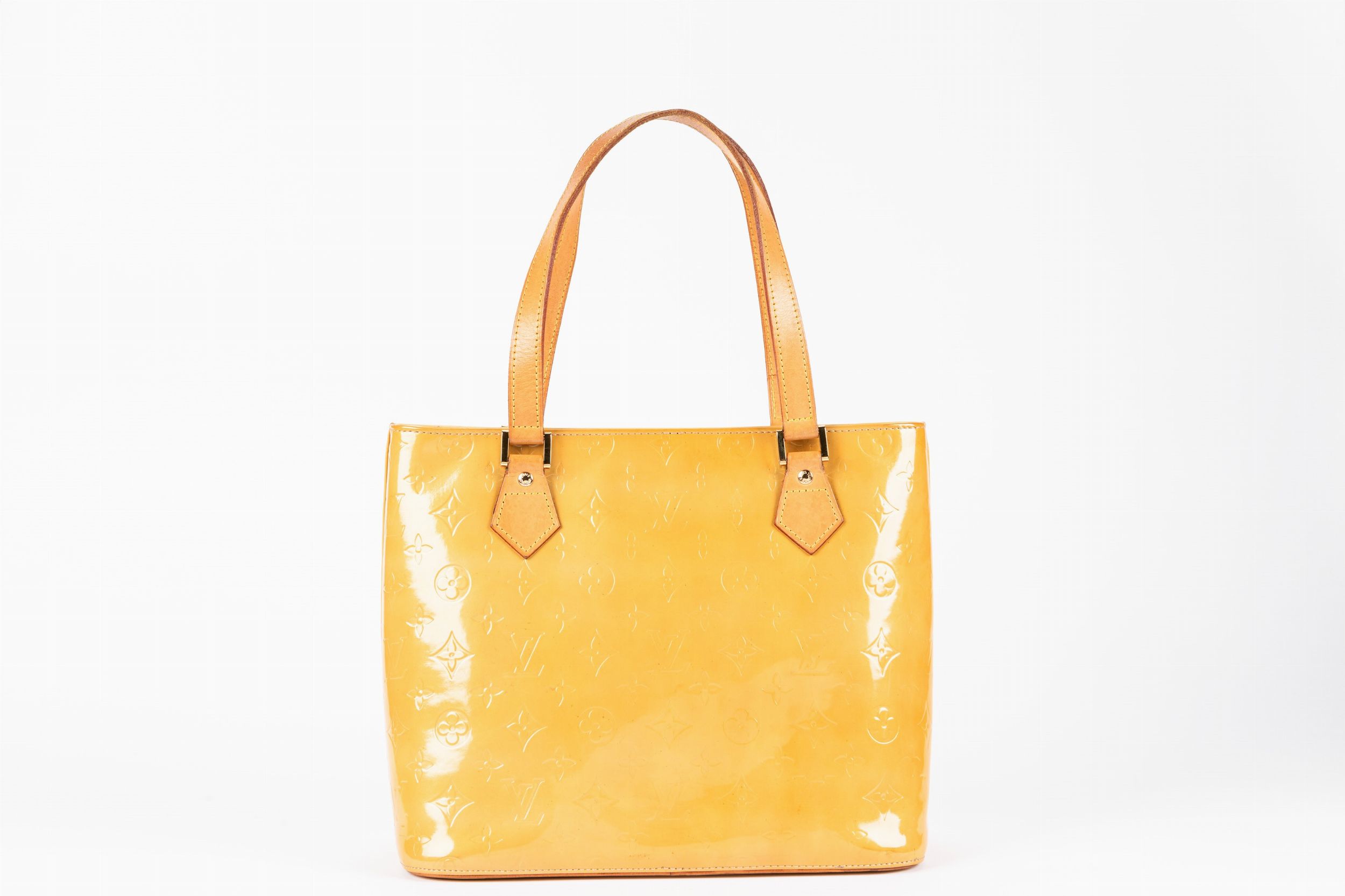 in pelle monogram vernis color giallo zafferano, manici in pelle, dettagli in metallo dorato, cm 29, con sacchetto (difetti)