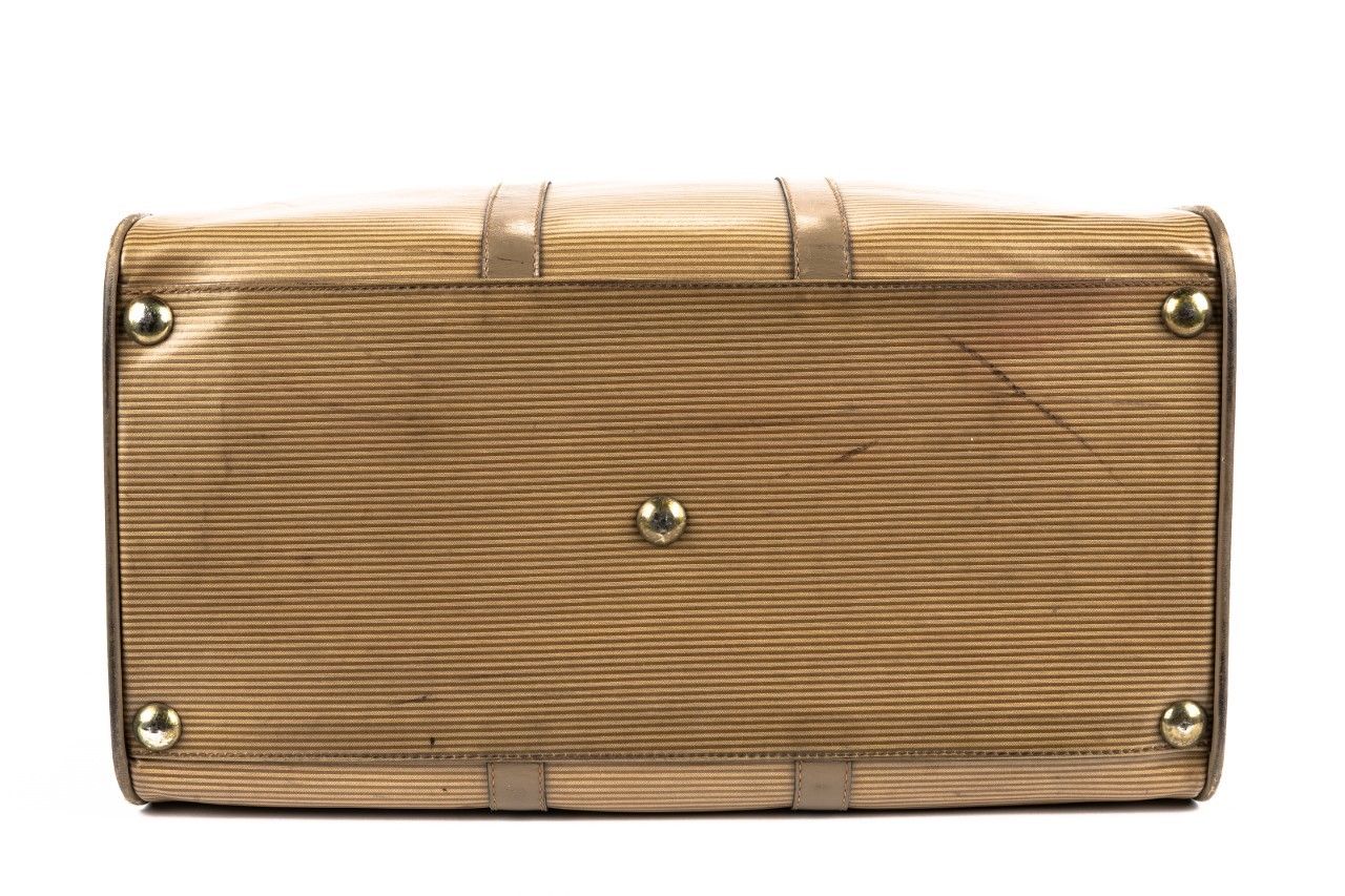 in tessuto plastificato e rigato, doppi manici e profili in pelle, interno in tessuto logato, dettagli in metallo dorato, cm 48 (difetti)