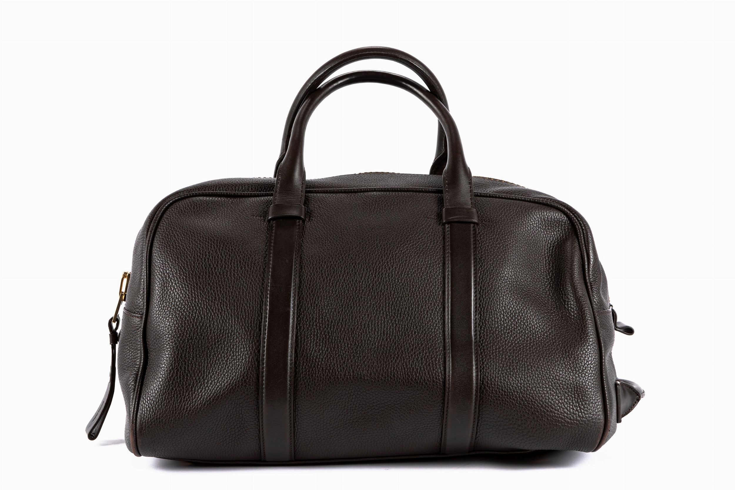 in pelle color marrone, chiusura a cerniera, doppi manici, cm 45, con sacchetto (difetti)