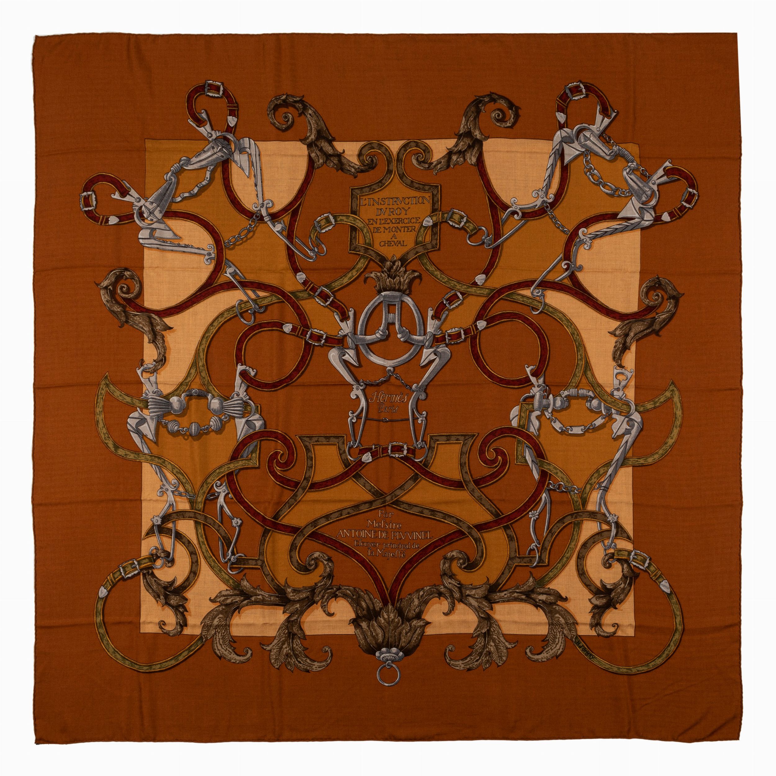 in cachemire e seta, stampa l'instruction du roy en l'exercice de monter a cheval su fondo color nocciola, cm 110x120, con scatola