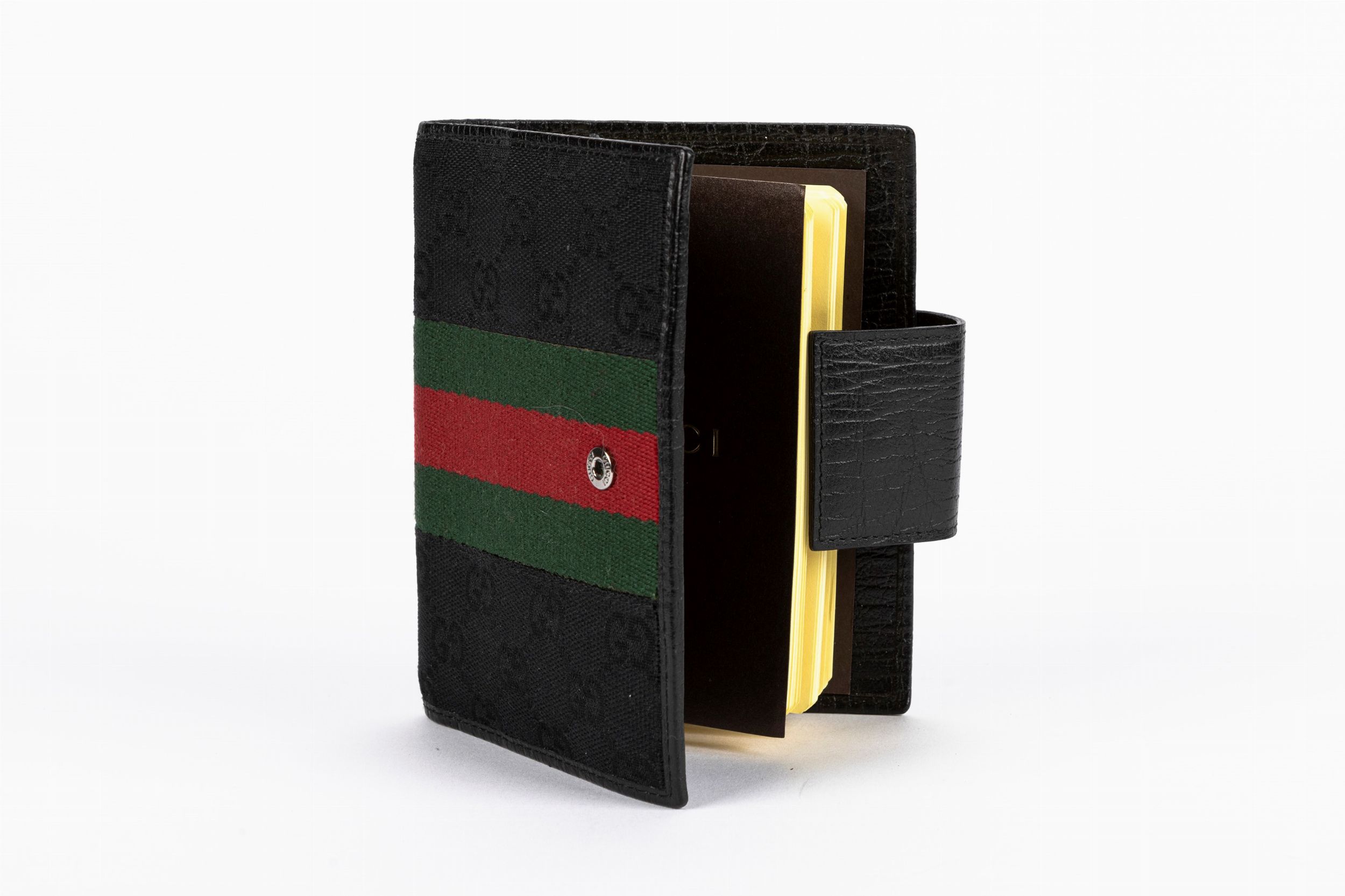 in pelle e tela GG color nero con banda web verde e rosso, cm 11x14