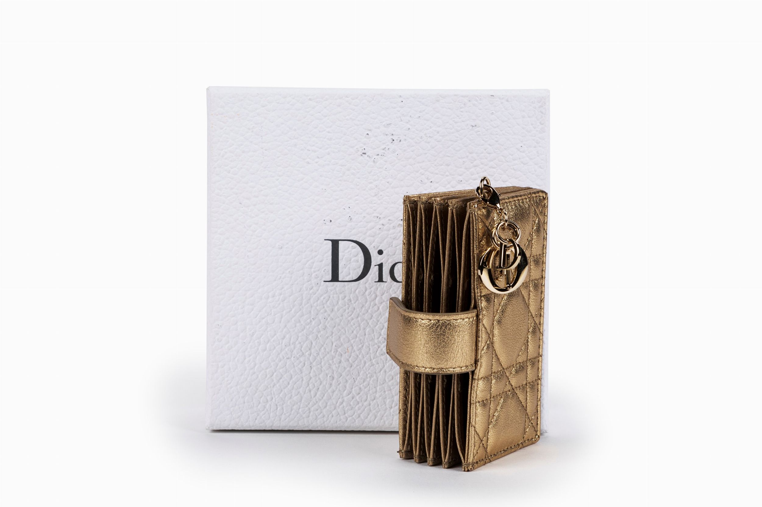 in pelle color oro chiaro, cm 10,5x6, con sacchetto e scatola