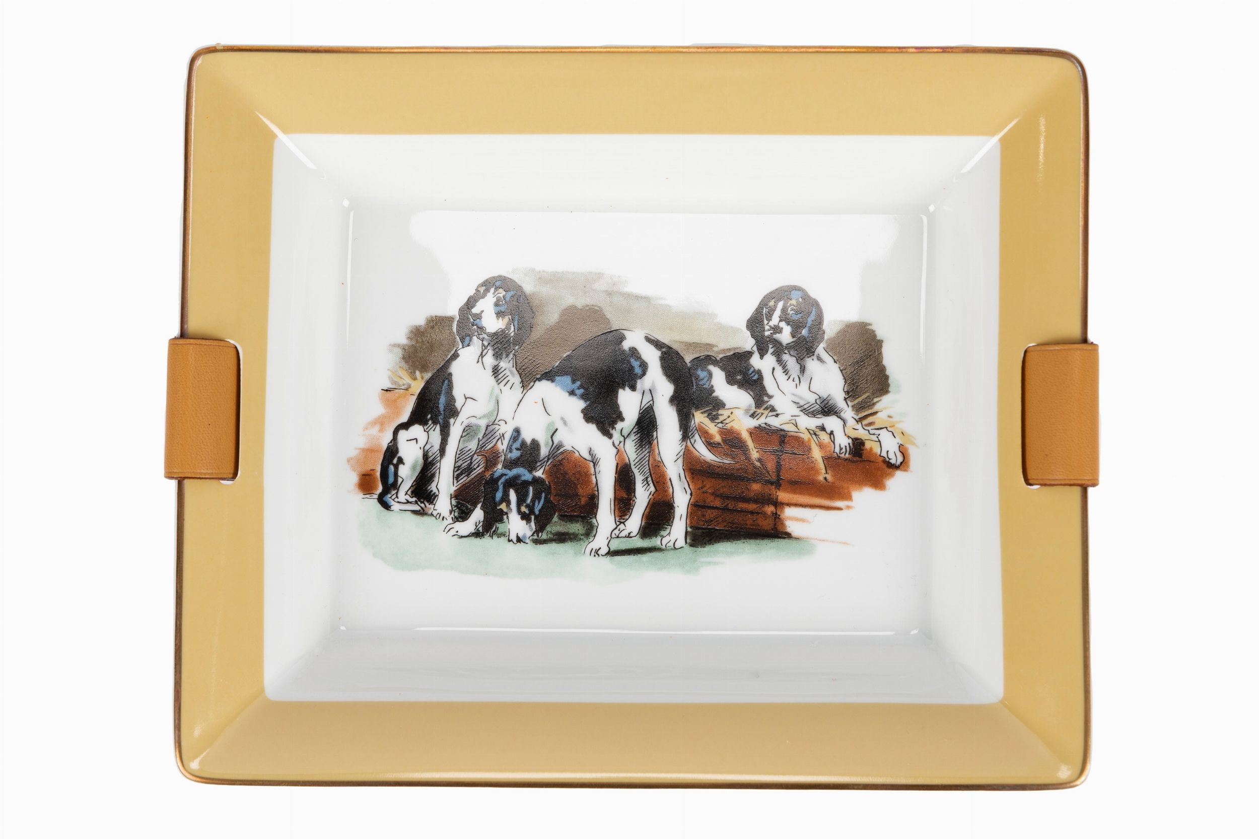 in porcellana bianca, bordo color senape e inserto in cuoio, decoro cani, cm 19x16,5, con scatola