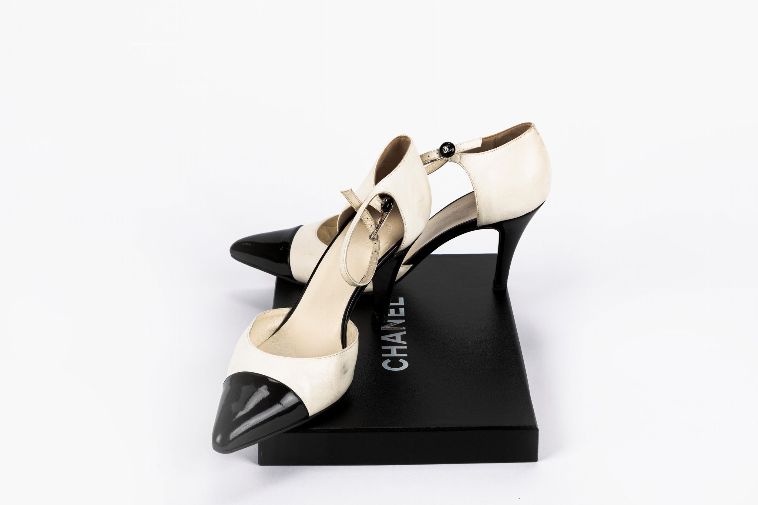 in pelle color panna, punta e tacco in vernice color nero, misura 40, tacco cm 8, con scatola (difetti)