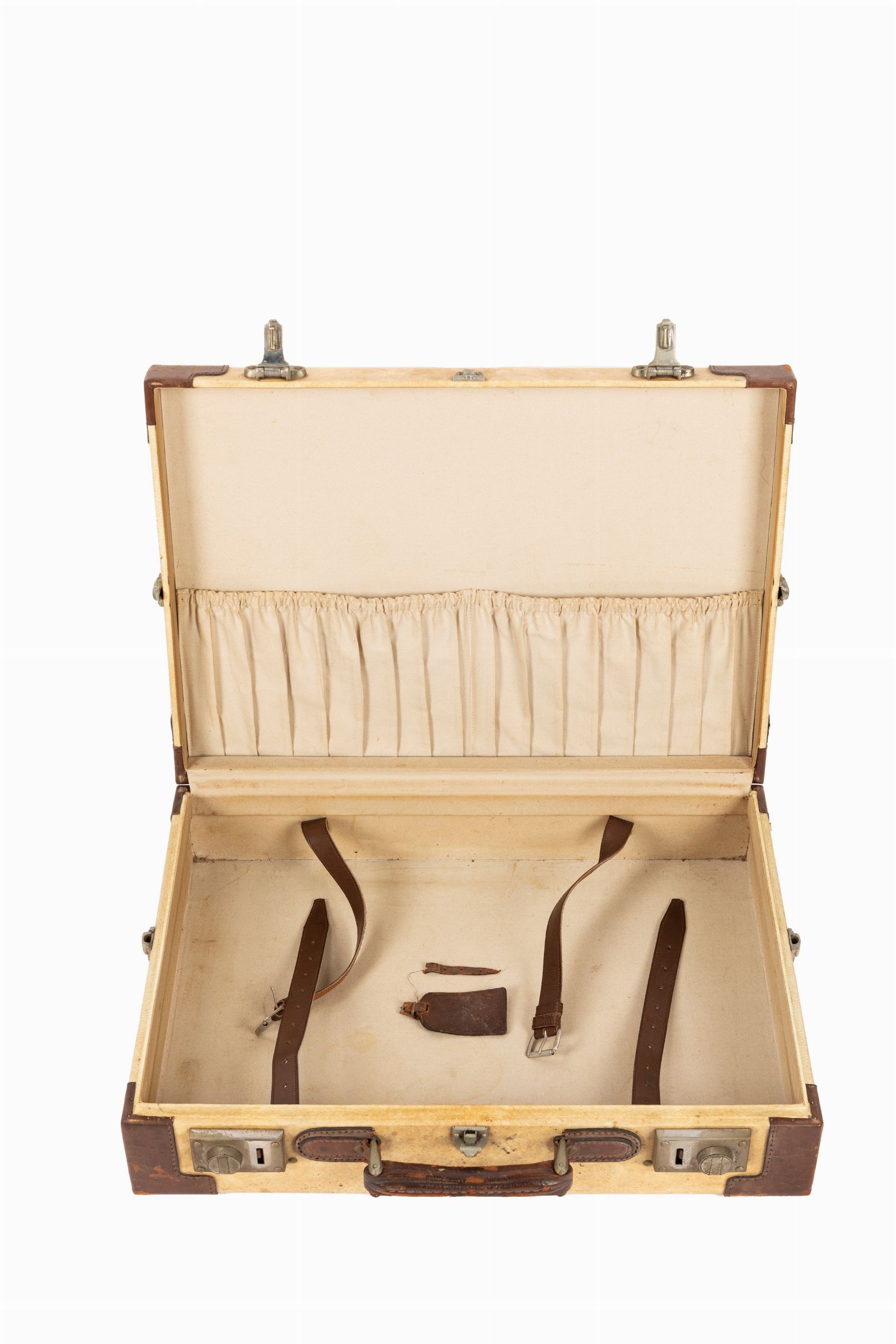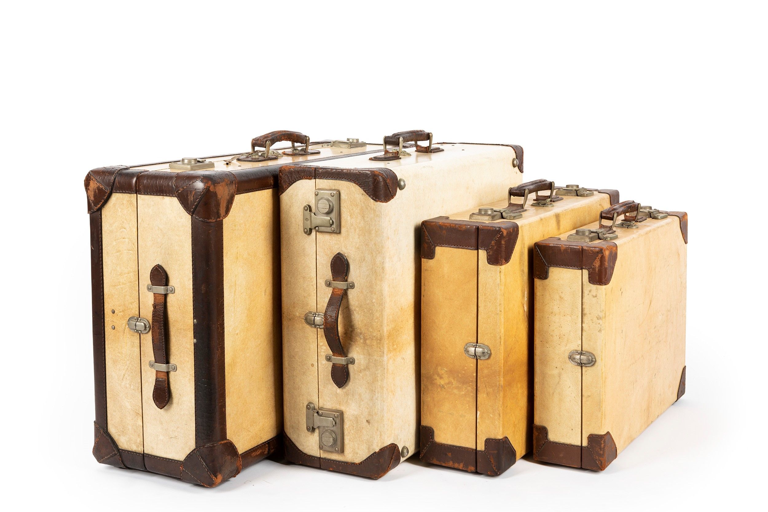 in pergamena e cuoio, dettagli in metallo, cm 55x40x14, cm 65x44x17, cm 65x54x22 e cm 82x53x28 (difetti)