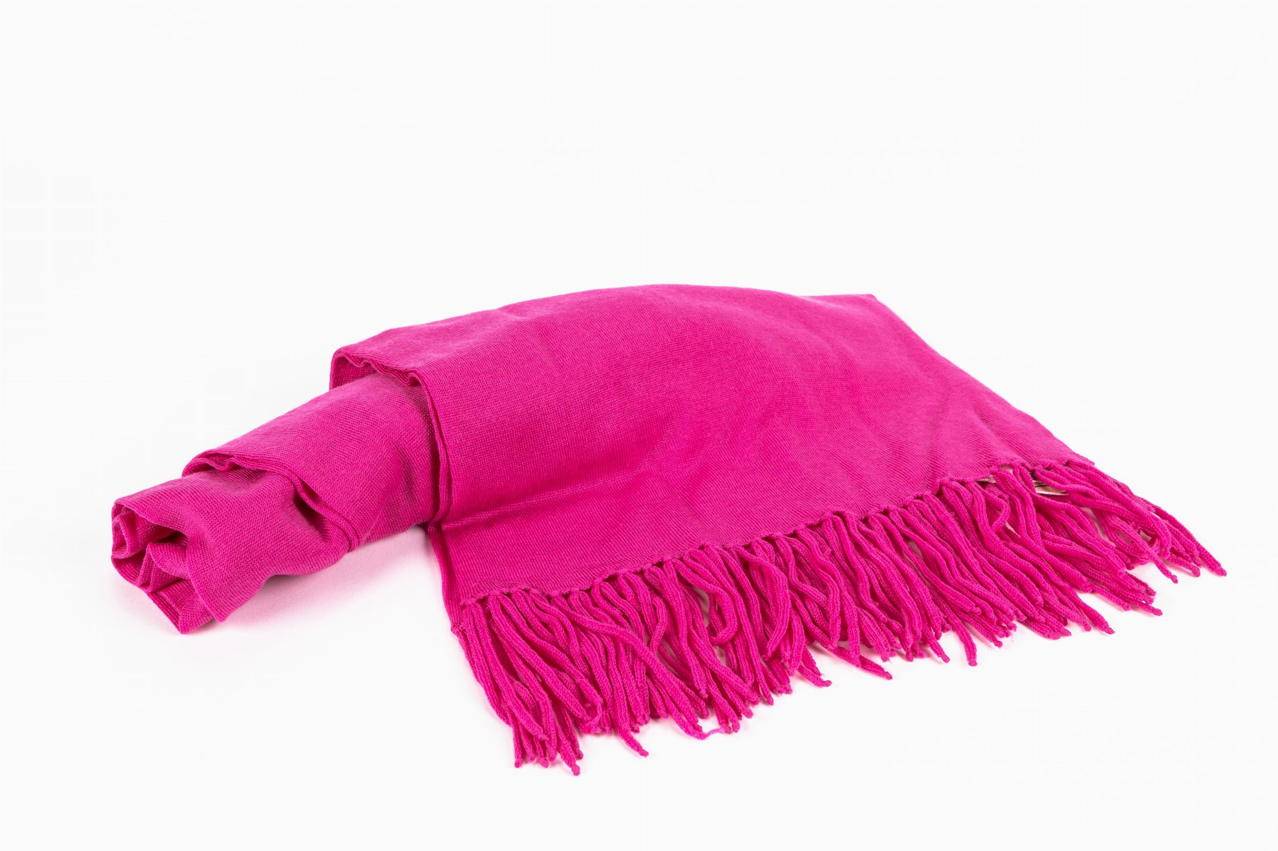 in lana merino color fucsia con frange, cm 180x28, con scatola (lievissimi difetti)