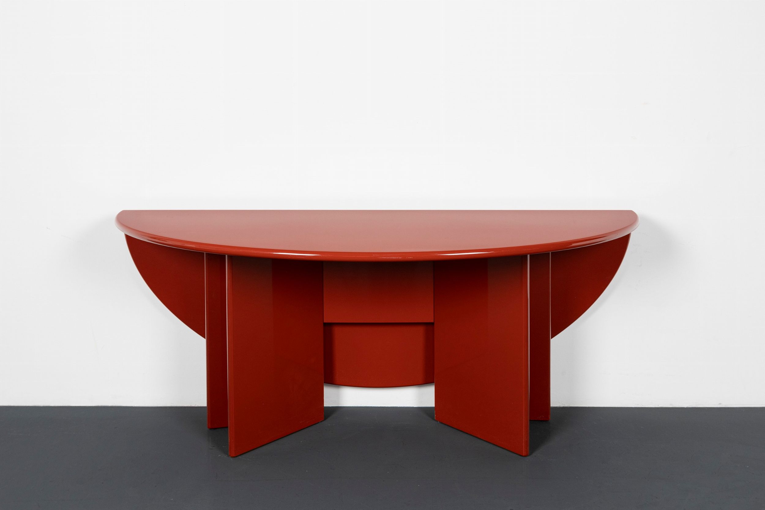 1978 Tavolo consolle di forma ovale in legno laccato rosso.