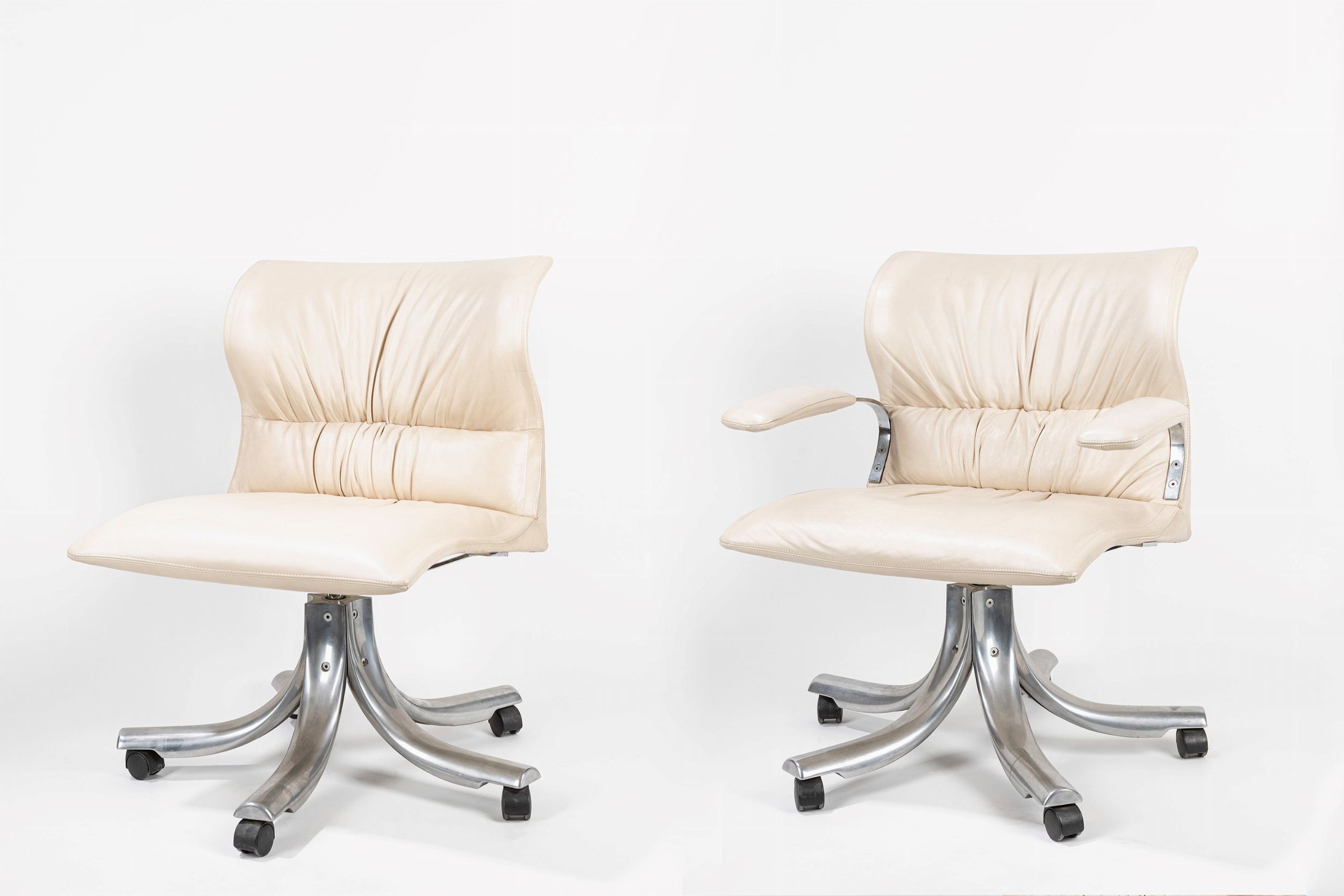 1960 ca. modello Vela con e senza braccioli. Pelle e struttura in metallo. Produzione Saporiti.