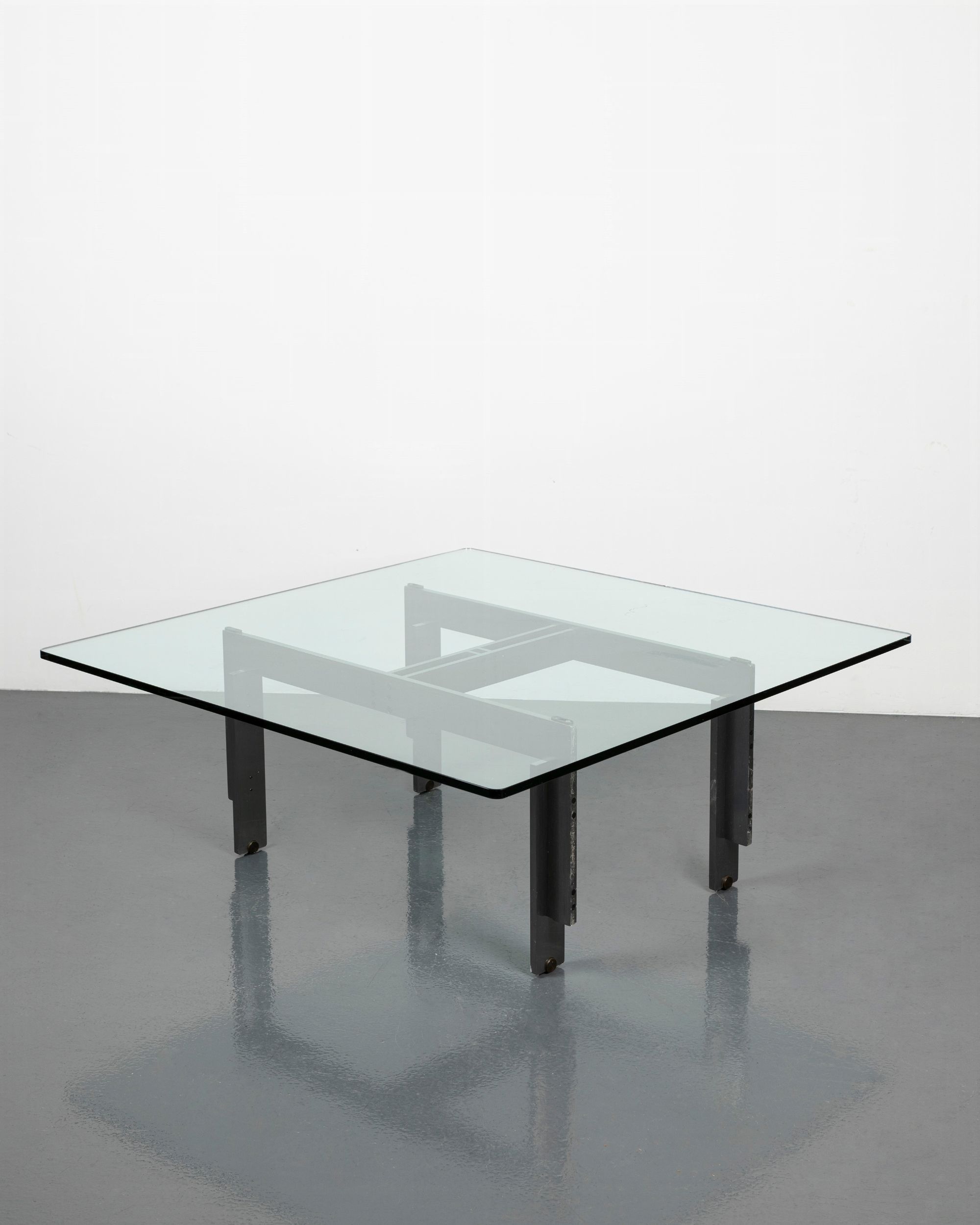 1970 ca. Tavolino con base in acciaio satinato e piano in cristallo. Produzione Simon, Bologna.