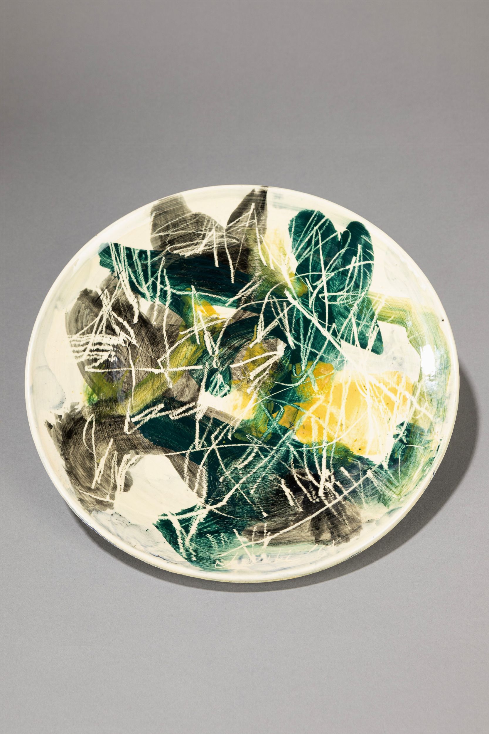 1961 ceramica smaltata in nero e giallo decorata a graffiti. Firma e data graffita.