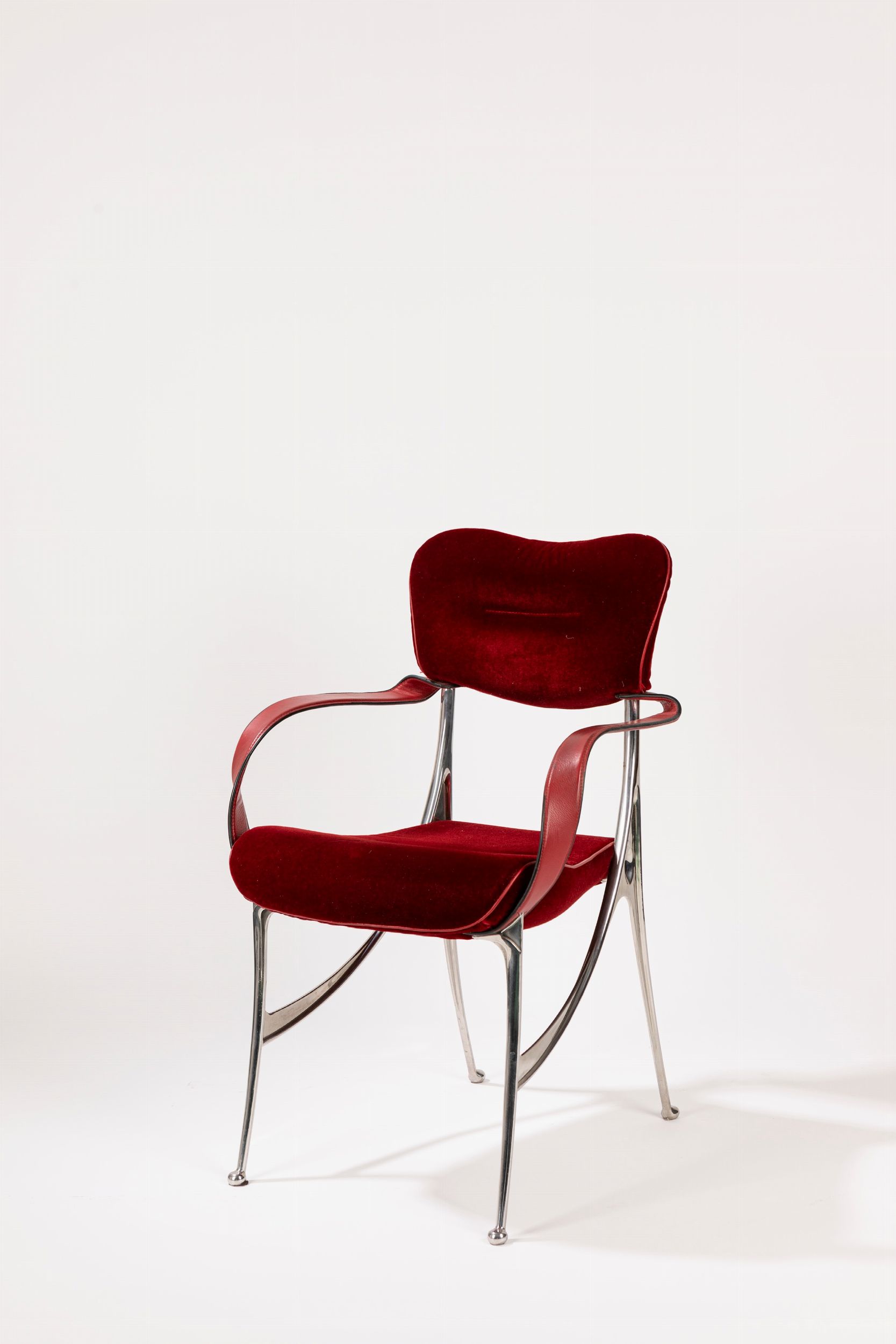 1987 struttura in acciaio inox lucidato con braccioli in piatto di acciaio sagomato ricoperto di pelle rossa; seduta e schienale in poliuretano rivestito in velluto rosso. Produzione Driade.