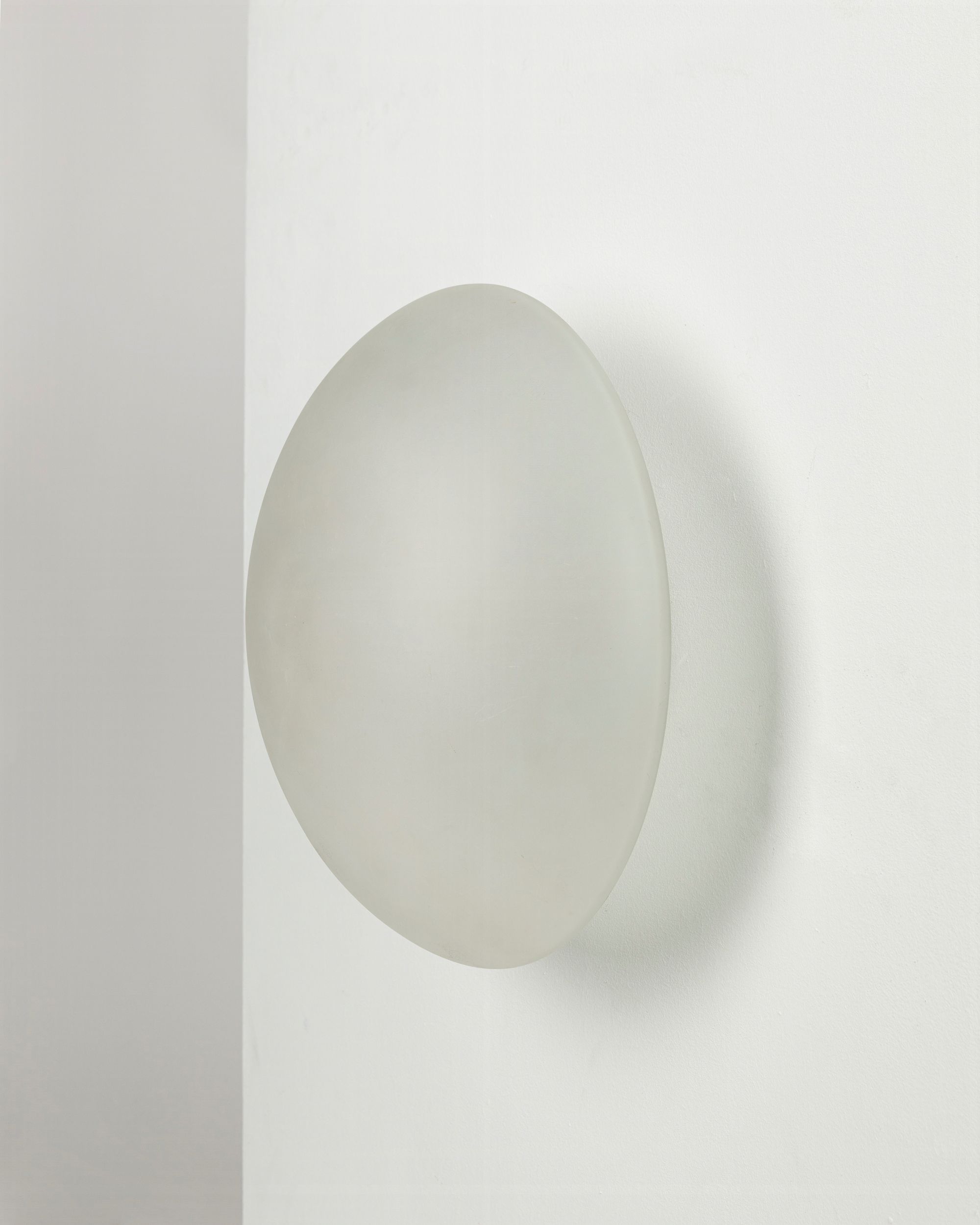 1989 Lampada da parete/plafone a luce diffusa dimmerabile a taglio di fase. Montatura in metallo verniciato. Diffusore in vetro borosilicato stampato sabbiato esternamente. Produzione Fontana Arte. Etichetta originale.