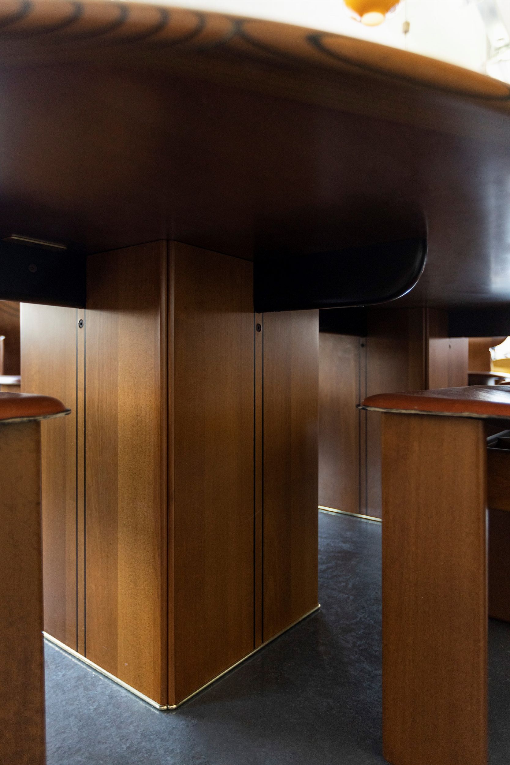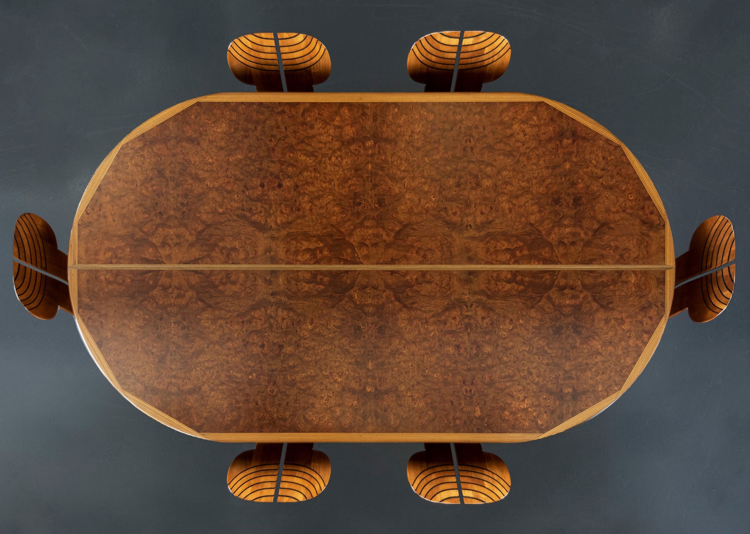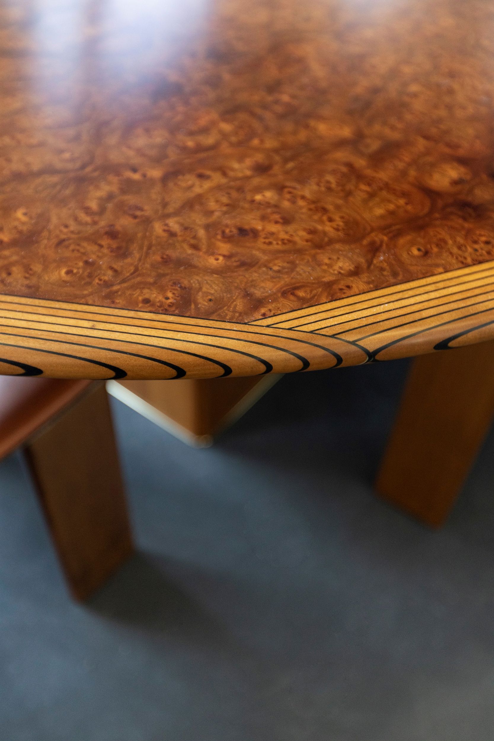 Tavolo: Largh. 145 - Prof. 145 - Alt. 70 cm Sedie: Largh. 55 - Prof. 40 - Alt. 80 cm 1970 ca. tavolo con struttura in legno di noce massello e radica, piano in legno laccato. Sedie struttura in legno e sedile in compensato curvato rivestito in pelle. Produzione Maxalto.