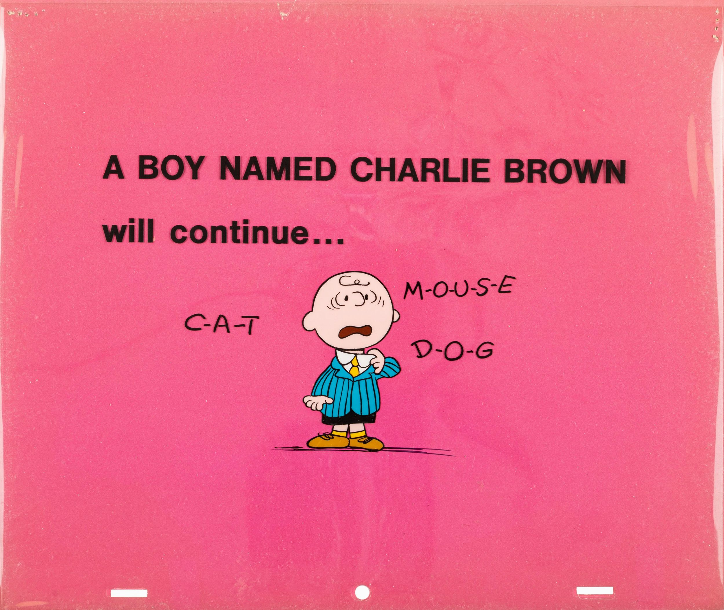 tempera su rodovetro, 32 x 26,5 cm 1969 Cel originale (3 fogli) realizzata da Melendez per il primo lungometraggio dei Peanuts A Boy Named Charlie Brown, distribuito nella sale nel 1969. La presente cel, che vede Charlie Brown alle prese con la temutissima gara di spelling, fu successivamente utilizzata come stacco pubblicitario nella versione televisiva del film.