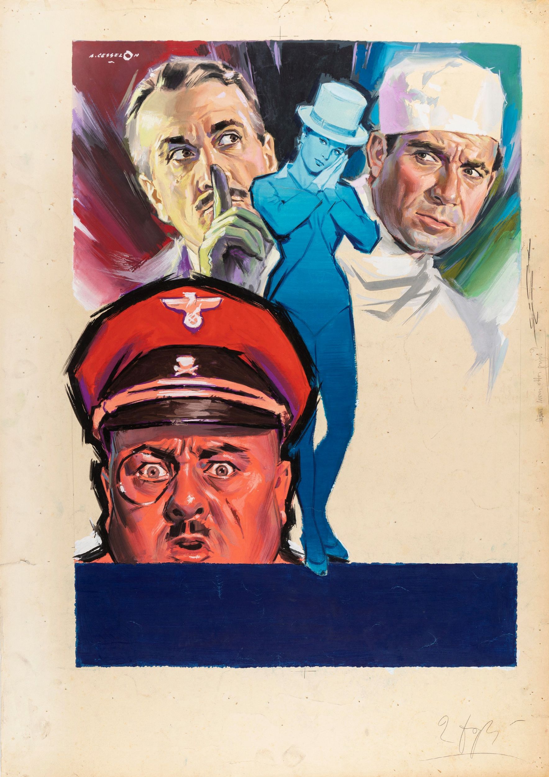 tempera su cartoncino, 70 x 100 cm 1960 Bozzetto originale realizzato da Cesselon per la locandina ufficiale del film A noi piace freddo...!, diretto da Steno con Ugo Tognazzi, Peppino De Filippo, Raimondo Vianello e Yvonne Furneaux nel 1960. Piccoli strappi, lievi pieghe e fori di affissione ai margini. Firmato.