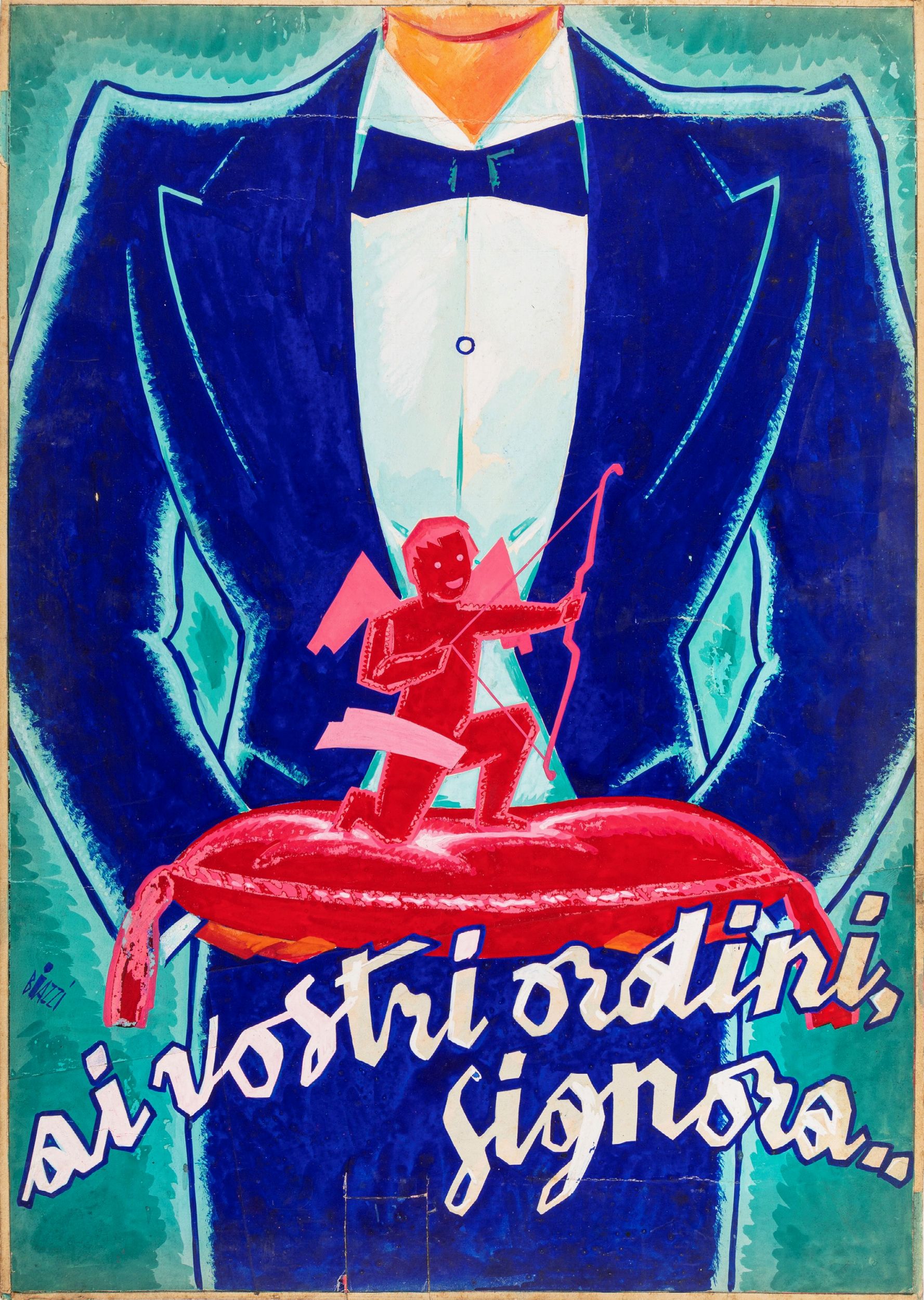 tempera su cartone, 35 x 50,5 cm 1939 Bozzetto originale realizzato da Biazzi per la locandina ufficiale del film Ai vostri ordini, signora..., diretto da Mario Mattoli con Elsa Merlini, Enrico Viarisio e Vittorio De Sica nel 1939. Lievi pieghe. Firmato.