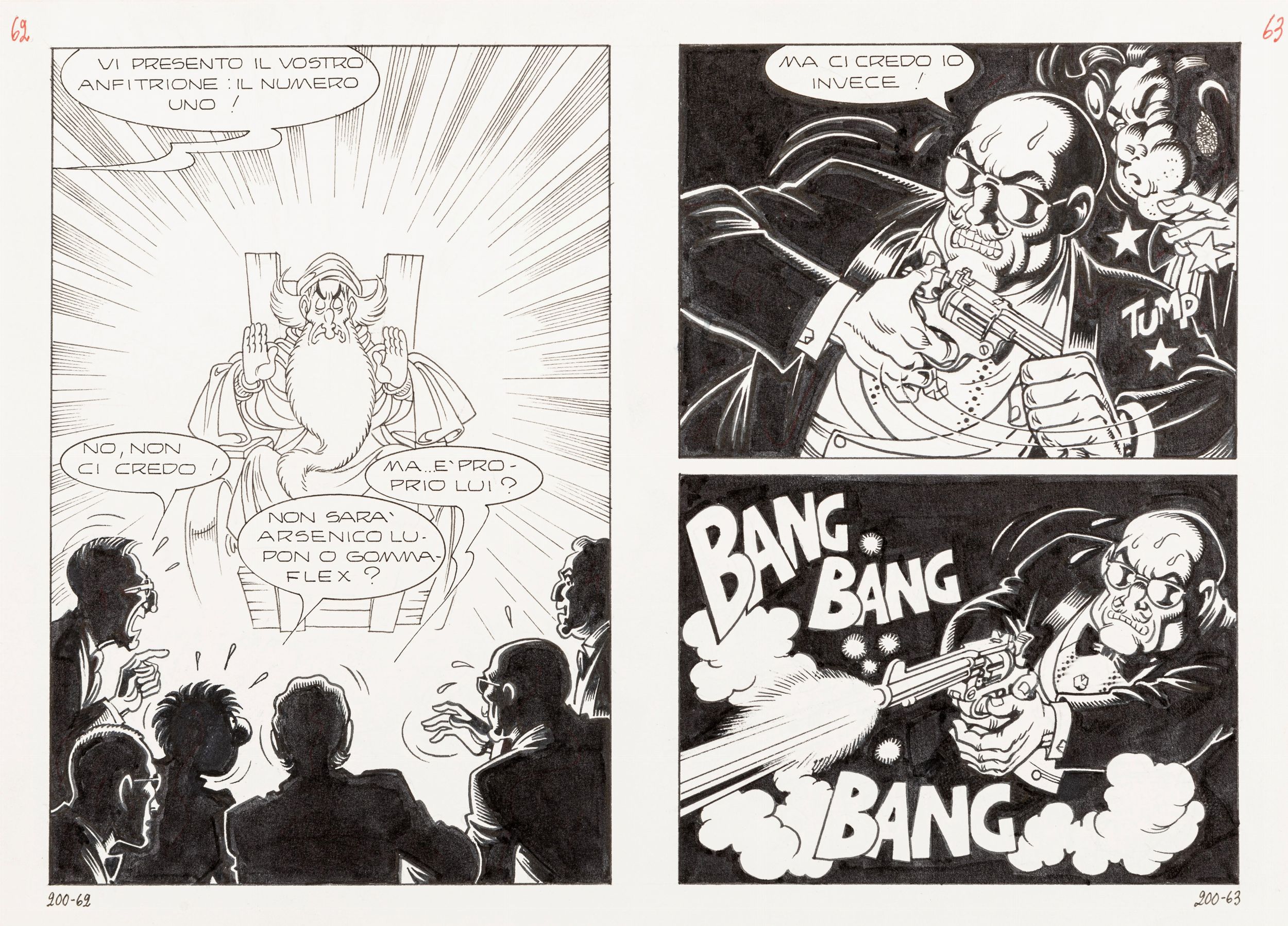 matita e china su cartoncino, 35 x 25 cm 1986 Doppia tavola originale realizzata da Magnus per lo storico numero 200 di Alan Ford Hic Hic Hurrà,edita alle pagine 62 e 63 dalla Editoriale Corno nel 1986. Dopo undici anni dall´abbandono della testata, Magnus torna a realizzare questo storico albo in cui viene finalmente svelata la presunta morte del Numero Uno.