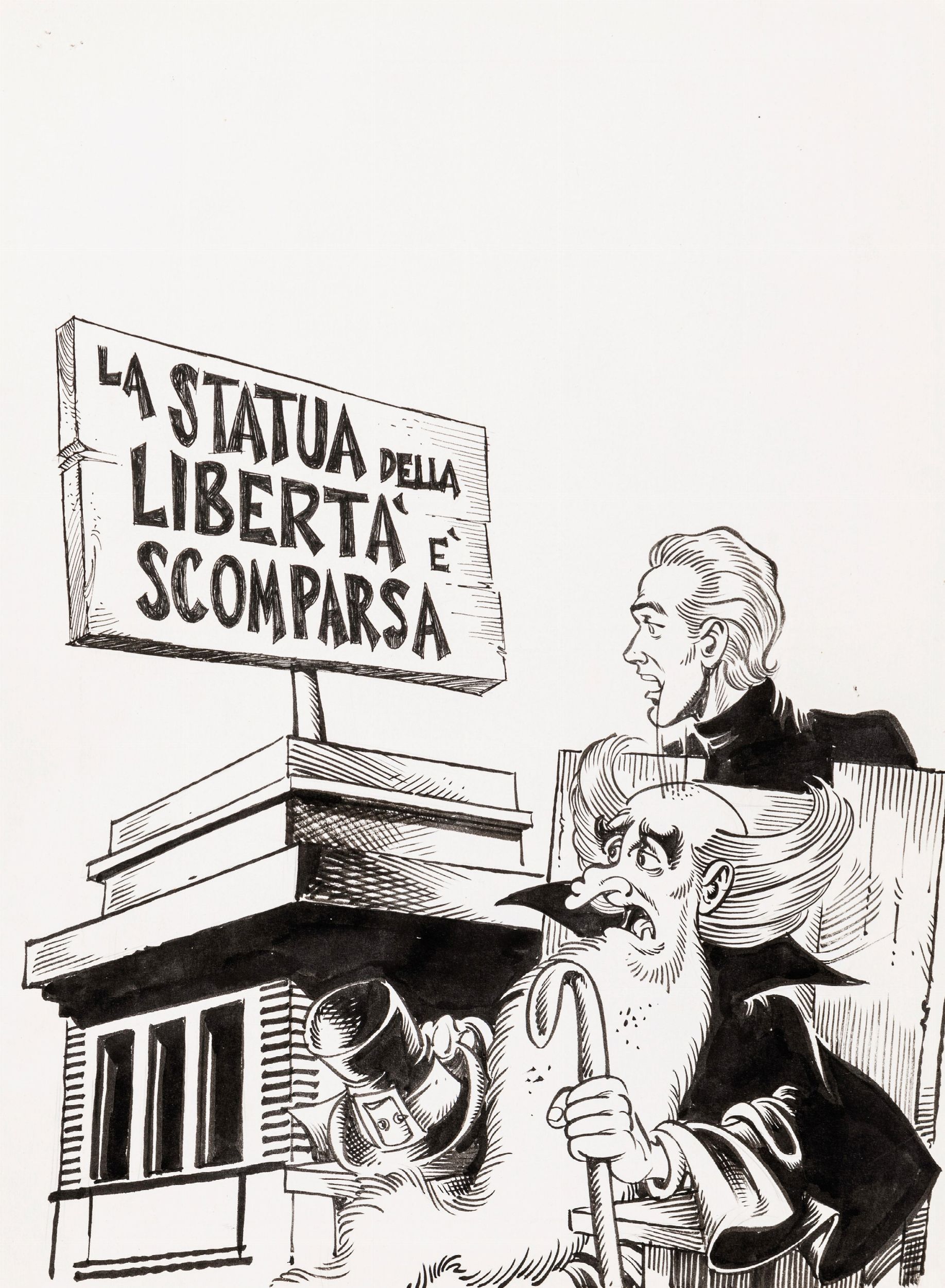 matita e china su cartoncino, 18,5 x 25 cm 1981 Originale di copertina realizzato da Piffarerio per La statua della libertà è scomparsa, edita su Gruppo TNT - Alan Ford n. 103 dalla Corno Editoriale nel 1981. Fori di affissione all'angolo superiore sinistro.