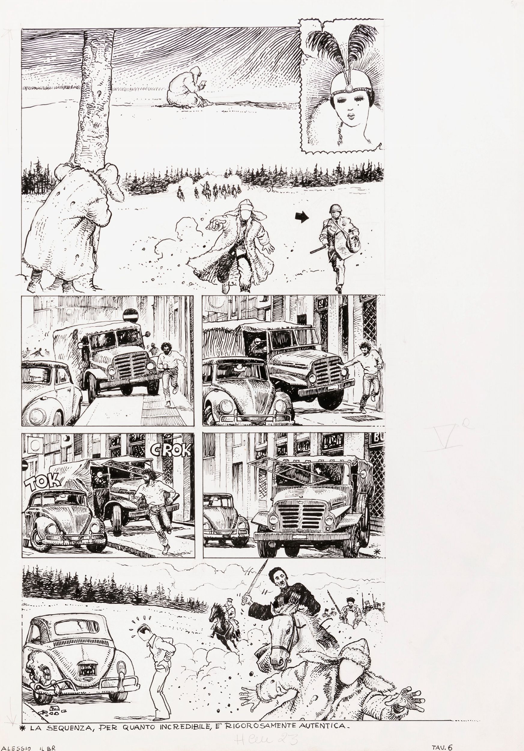 matita e china su cartoncino, 35,5 x 50 cm 1977 Tavola originale per Alessio il Borghese rivoluzionario, edita a pag. 6 per la prima volta sulla rivista AlterAlter nel 1977 sui testi di Silverio Pisu. Un’opera dai connotati fortemente politici e tecnicamente tra i migliori lavori di Manara.