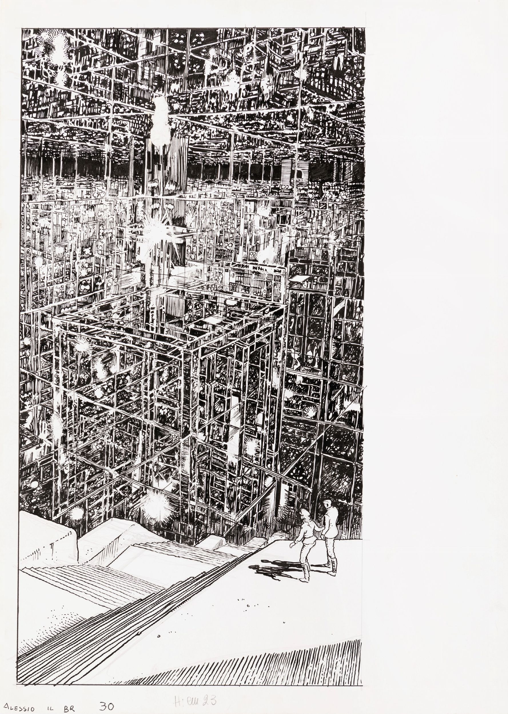 1977 Tavola originale per Alessio il Borghese rivoluzionario, edita a pag. 30 per la prima volta sulla rivista AlterAlter nel 1977 sui testi di Silverio Pisu. Un’opera dai connotati fortemente politici e tecnicamente tra i migliori lavori di Manara. Piccola abrasione di 3,5 cm sul disegno.