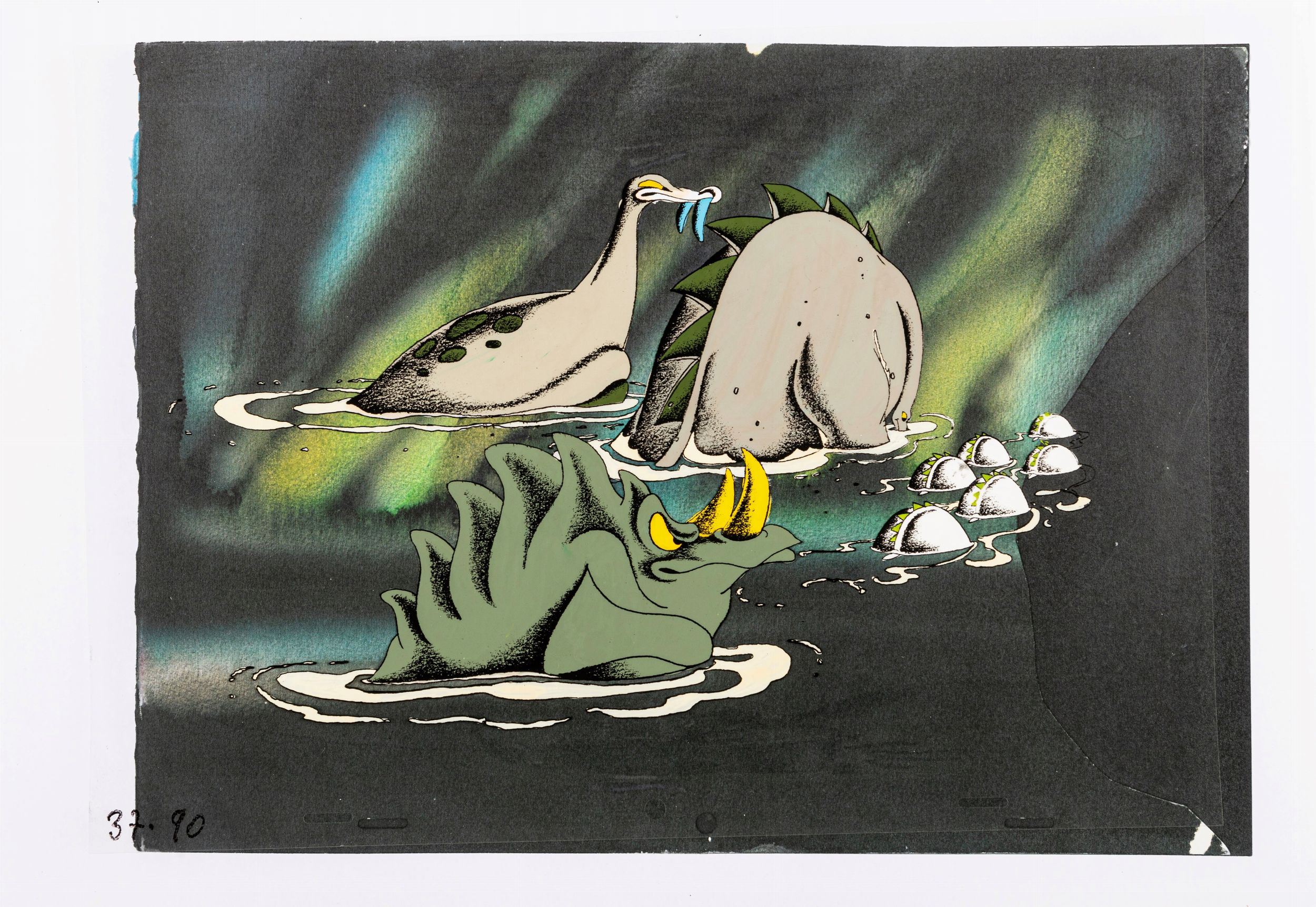 1976 Cel originale su fondale riprodotto per il Bolero di Maurice Ravel, il principale e più celebre episodio animato di Allegro non troppo, film prodotto e diretto da Bruno Bozzetto nel 1976. Conosciuto anche con il nome di La marcia dei dinosauri, il Bolero è l´episodio attorno al quale si è sviluppato l´intero film, il più complesso dal punto di vista tecnico (richiese due anni di lavorazione) e il più amato dallo stesso Bozzetto. Dal liquido di una Coca-Cola abbandonata da un´astronave comincia l´evoluzione della vita, partendo da un brodo primordiale le creature si evolvono e, in vero stile Darwiniano, cercano di mangiarsi a vicenda, arrivando così a uccelli, serpenti, dinosauri, scimmie e umani. La scena da noi presentata è presente al minuto 9:32 (https://www.youtube.com/watch?v=5pgANtzO2G4).