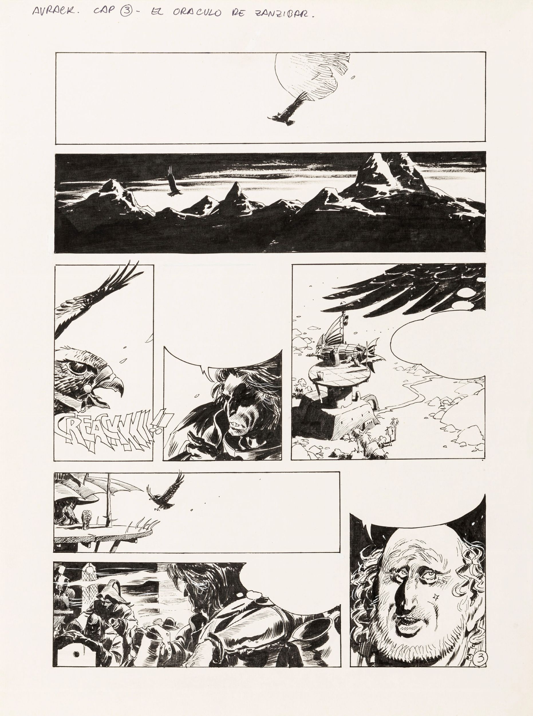 matita e china su cartoncino, 30 x 40 cm 1987 Tavola originale realizzata da Breccia per El oráculo de Zanzibar, pag. 3 del terzo capitolo di Avrack, saga fantascientifica edita per la prima volta in argentina su Super Skorpio n. 141 nel 1987. Testi di Ricardo Barreiro.