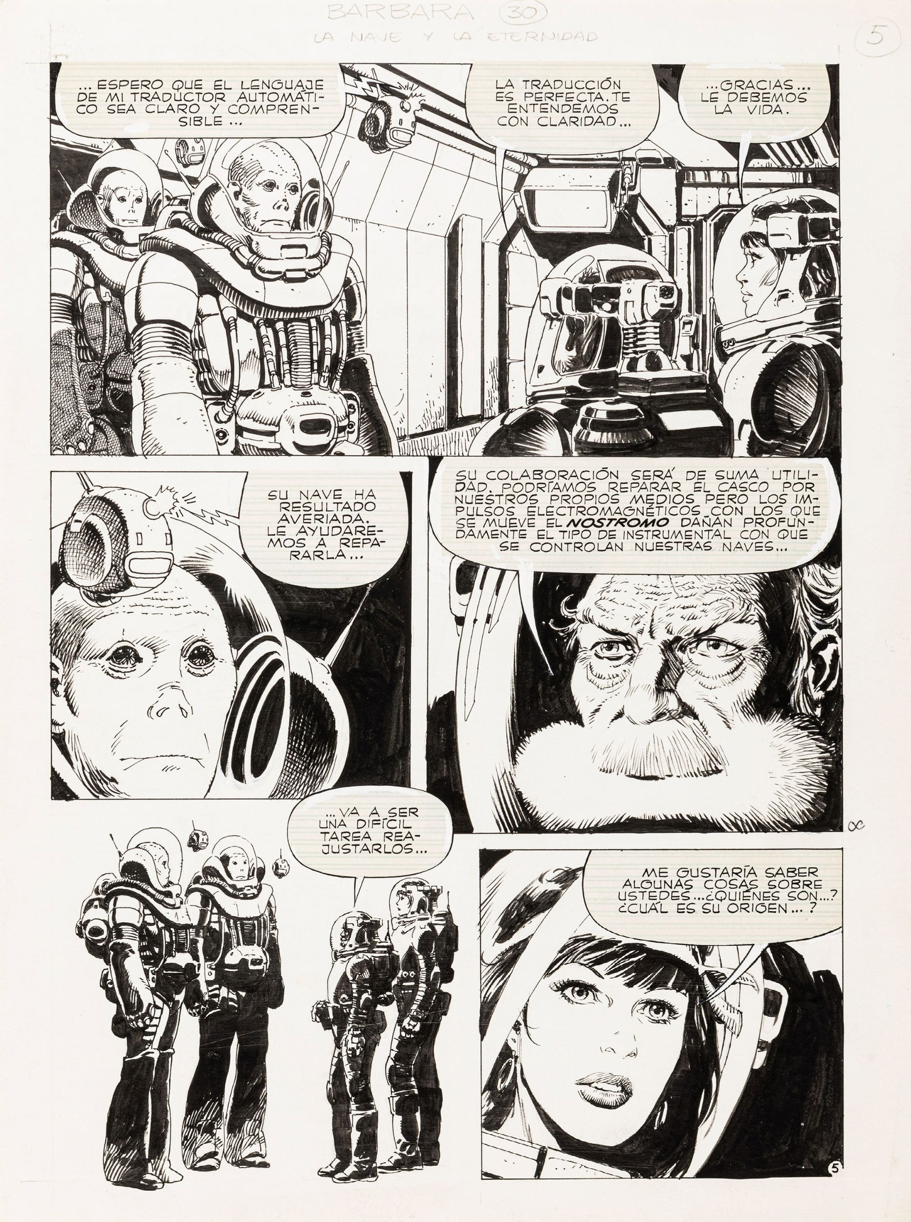 matita e china su cartoncino, 28 x 37,5 cm 1982 Tavola originale realizzata da Zanotto per La nave y la eternidad, pag. 5 di questo episodio di Barbara pubblicato per la prima volta sulle pagine della rivista argentina Skorpio n. 87 dalle Ediciones Récord nel 1982.