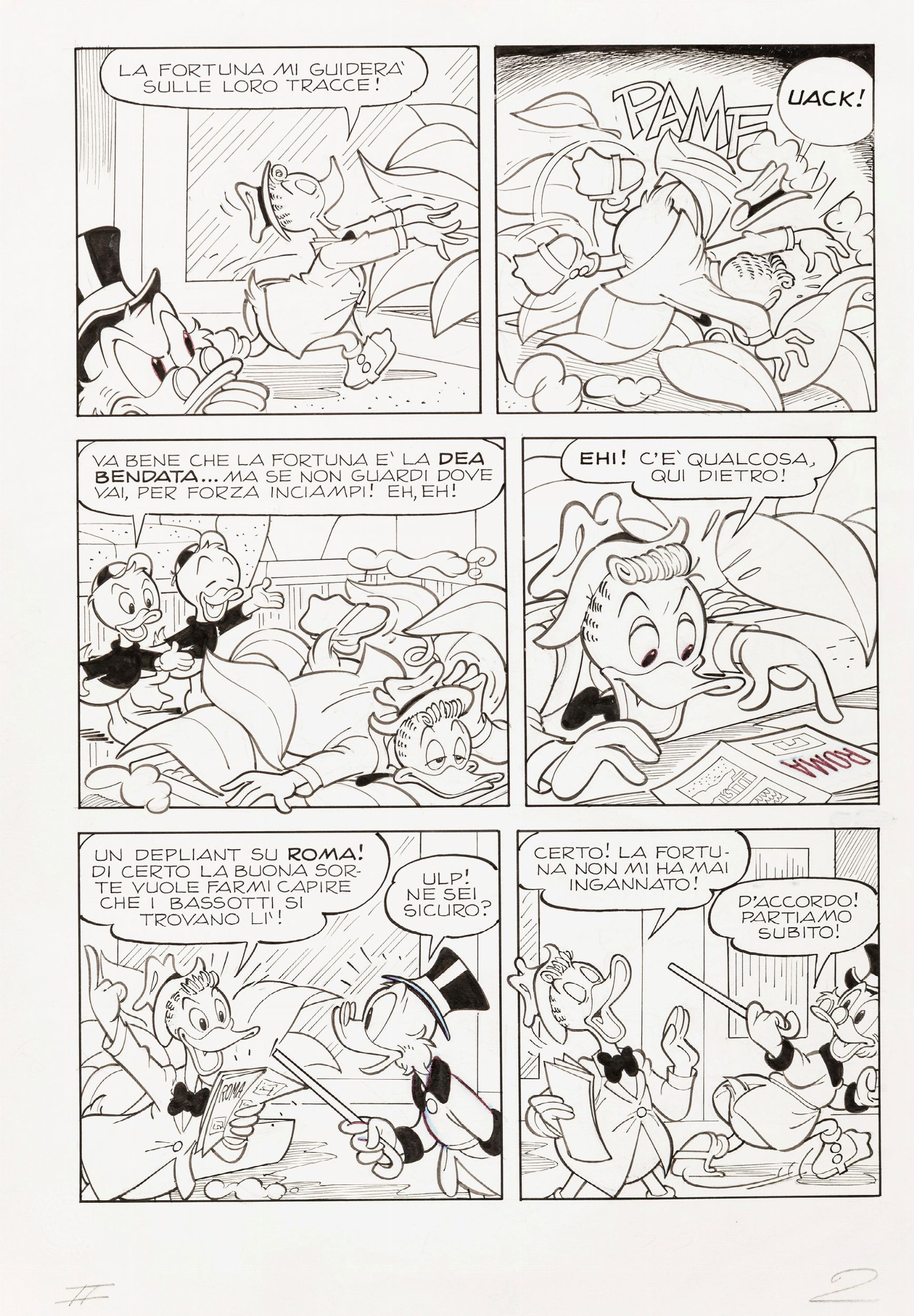 1994 Tavola originale realizzata da Scarpa per “Chi ha rubato Topolino 2000?” edita su Topolino n. 1997 a pag. 2 nel marzo 1994. Storica avventura corale di topi e paperi che accompagnarono i lettori al fatidico traguardo del numero 2000.