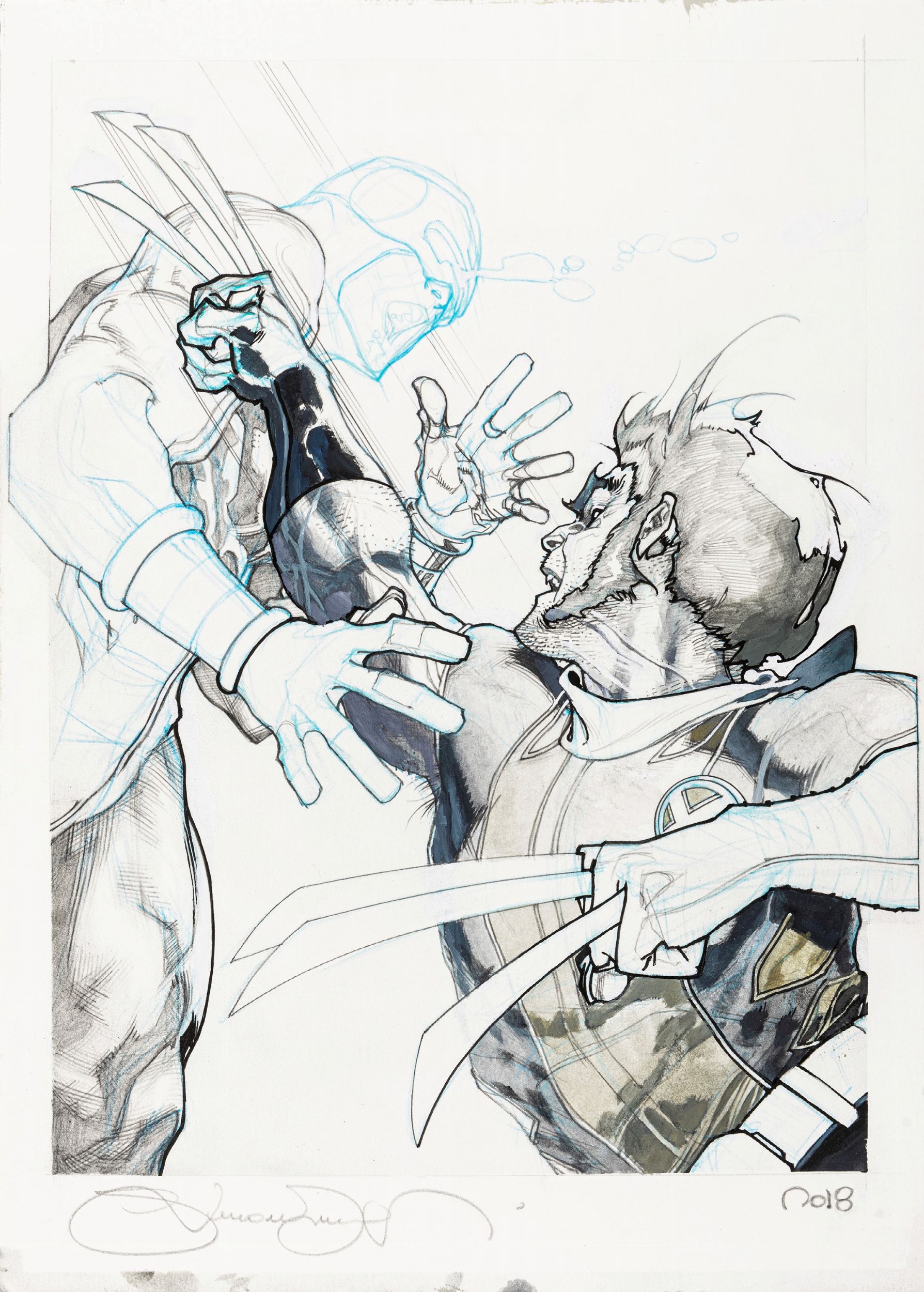 2018 Disegno preliminare realizzato da Bianchi per la card n. 9 della serie Marvel Masterpieces Battle Spectra Gems Cyclops vs Wolverine prodotta dalla Marvel nel 2018. Firmata e datata.