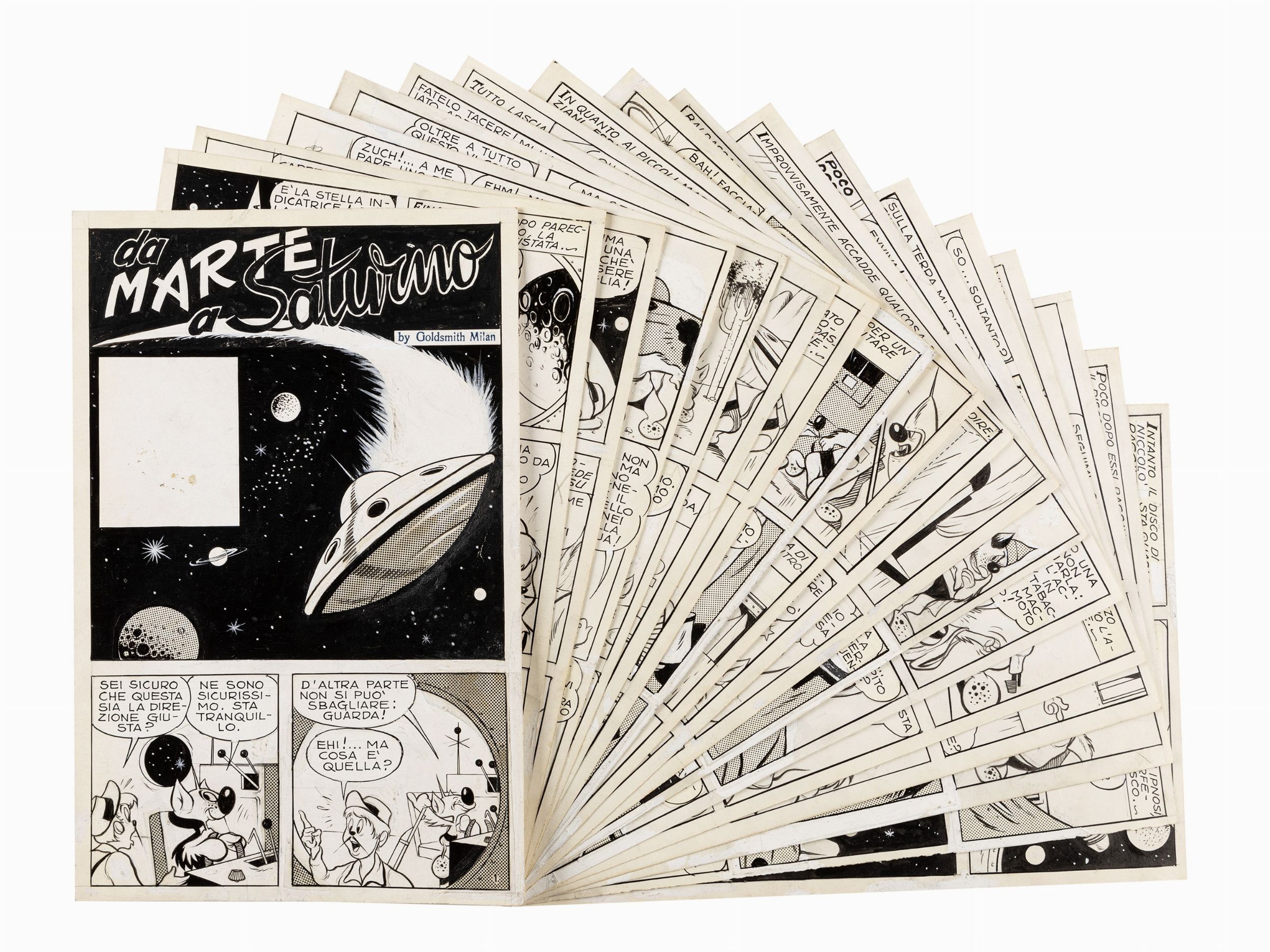 matita, china e retino su cartoncino, 17 x 26 cm 1955 Storia completa composta da 18 tavole originali realizzate dall'autore croato Goldsmith per Da Marte a Saturno, avventura fantascientifica che vede protagonista l'alieno Baldassarre e il terrestre Niccolò. Alcune tavole acquerellate al retro. Datata a pag. 10.