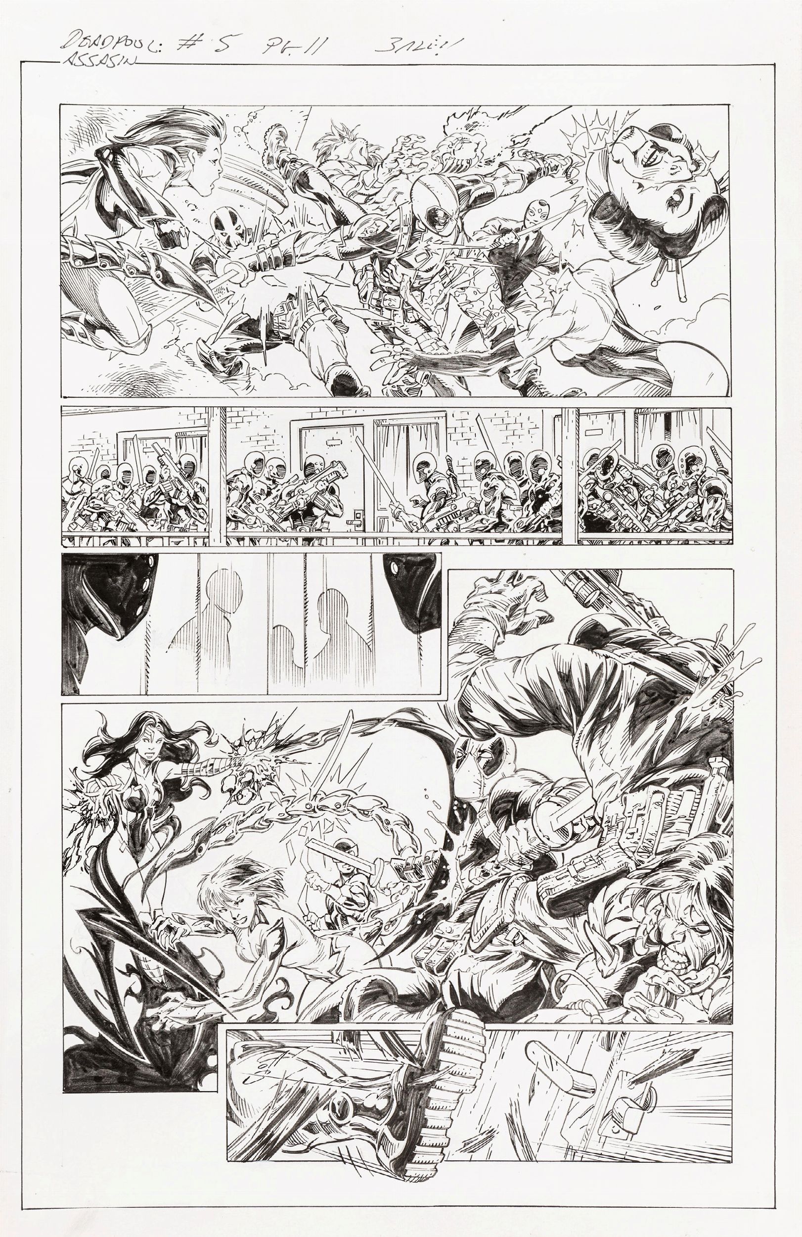 2018 Tavola originale realizzata da Bagley per la miniserie Deadpool: Assassin n. 5, edita a pag. 11 dalla Marvel nel 2018. Firmata.