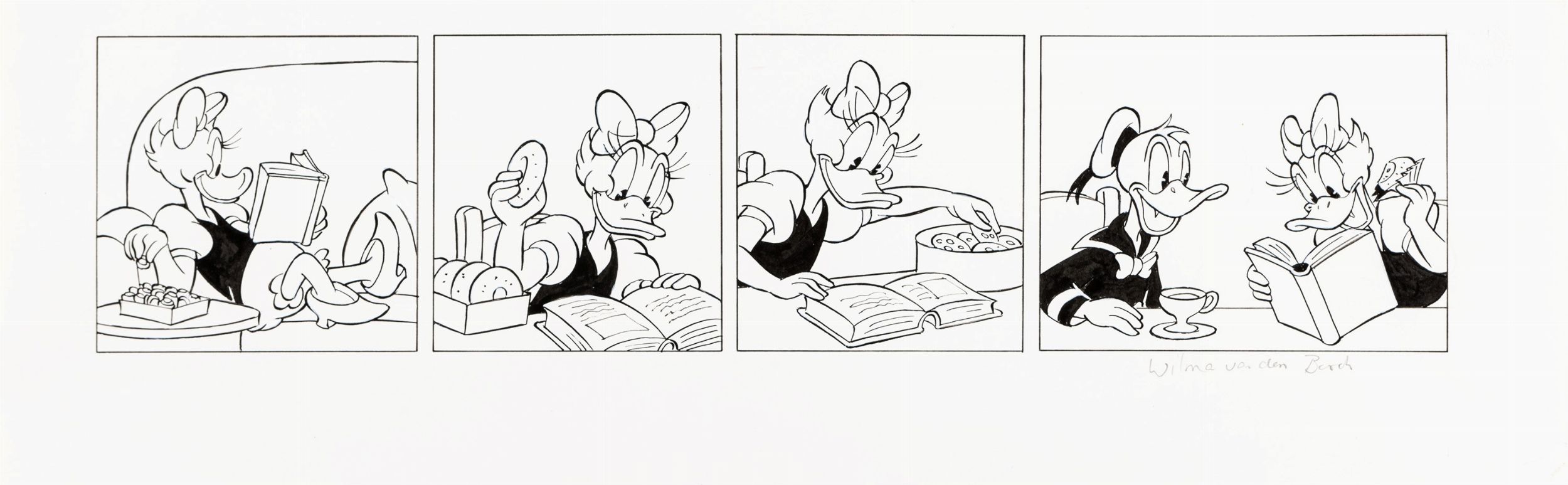 2010 Striscia originale realizzata dall'autrice olandese Van den Bosch per Dieetboek, striscia autoconclusiva pubblicata in Olanda su Donald Duck nel 2010. Firmata.