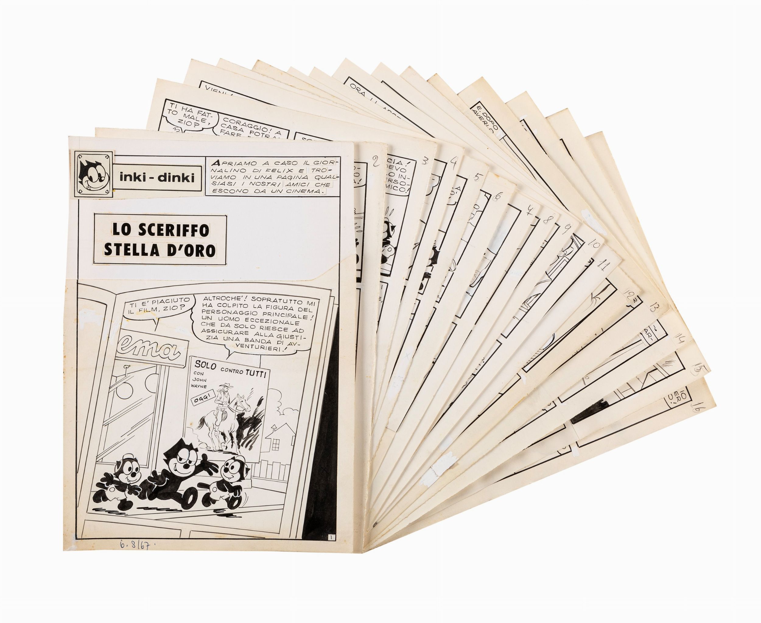 1967 Storia completa composta da 16 tavole originali realizzate da Dossi per Lo Sceriffo Stella d'Oro, edita su Gatto Felix n. 6 nel 1967. Firmata al retro di ogni pagina.
