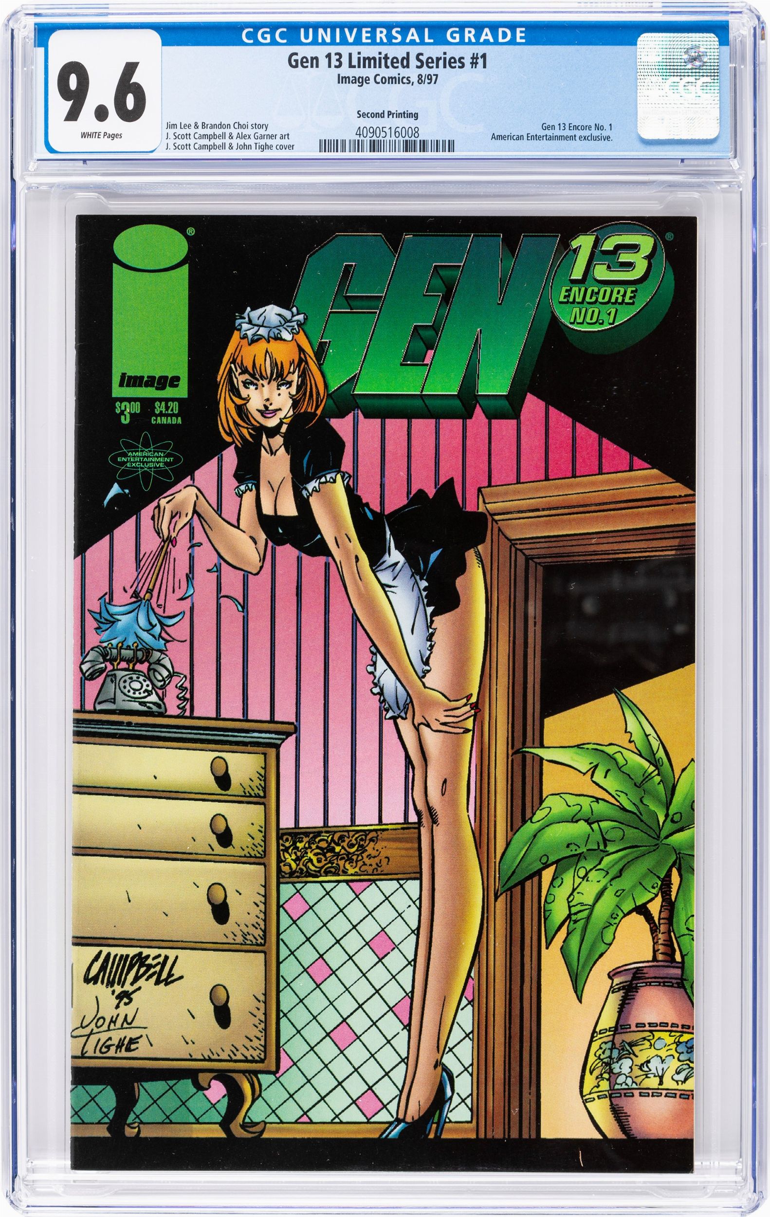 1997 Comic book certificato dalla CGC con un grading 9.6 (CGC Cert # 4090516008), case sigillato e in ottime condizioni. CGC Comments: Gen 13 Encore No. 1 American Entertainment exclusive.