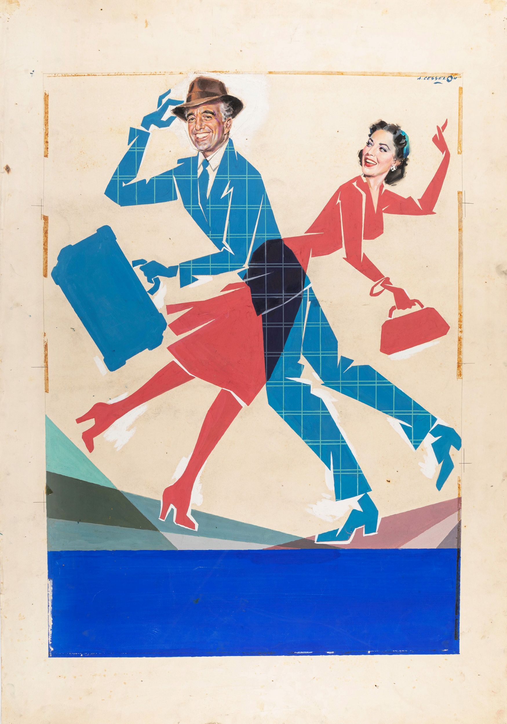 tempera su cartoncino, 70 x 100 cm 1955 Bozzetto originale realizzato da Cesselon per la locandina ufficiale del film Gli ultimi cinque minuti, diretto da Giuseppe Amato con Peppino De Filippo, Linda Darnell e Vittorio De Sica nel 1969. Piccoli strappi e lievi pieghe al margine sinistro, fori di affissione. Firmato.