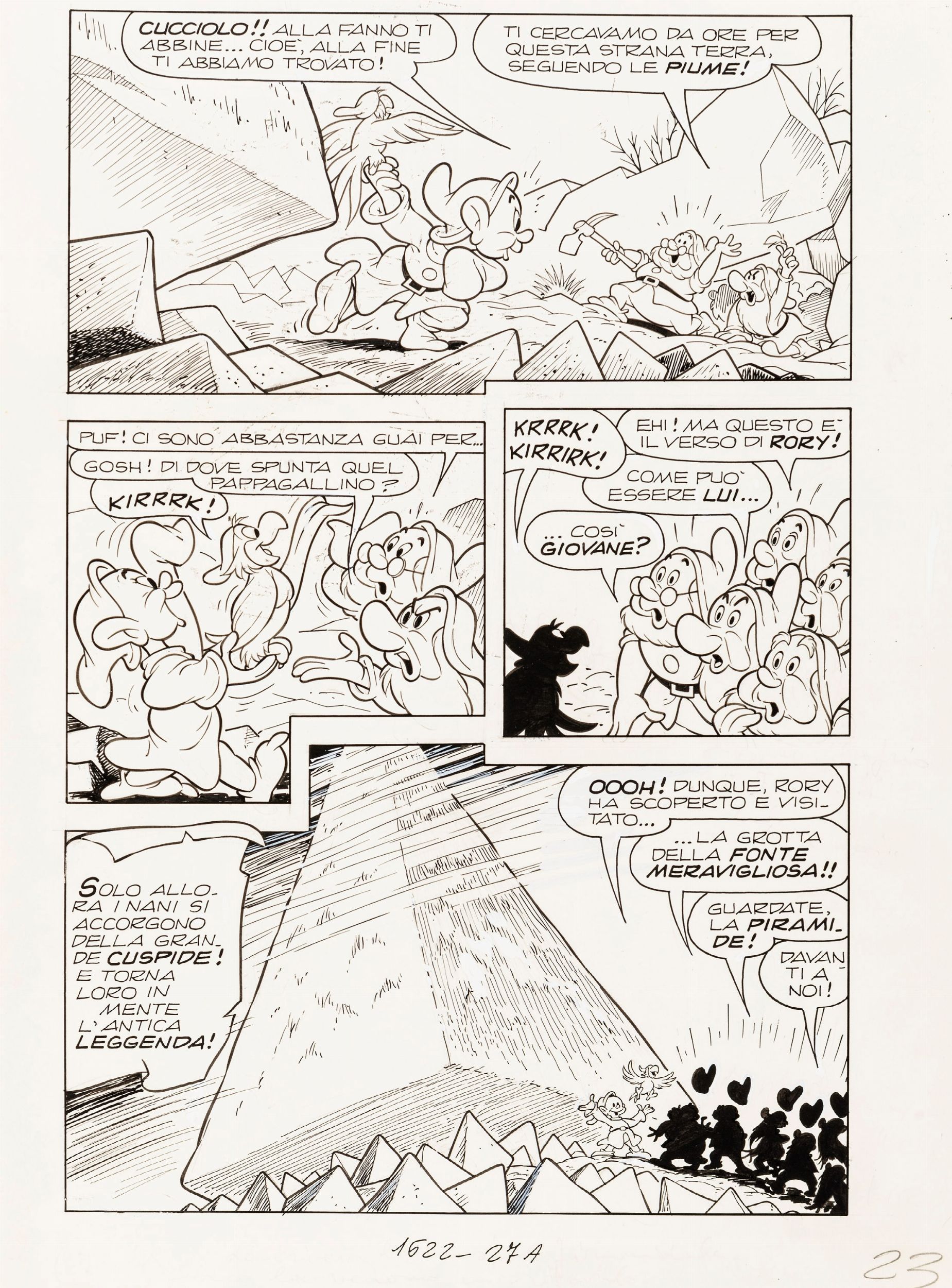 1986 Tavola originale realizzata da Scarpa per I 7 Nani e la fonte meravigliosa, edita su Topolino n. 1622 a pag. 23 nel dicembre 1986.
