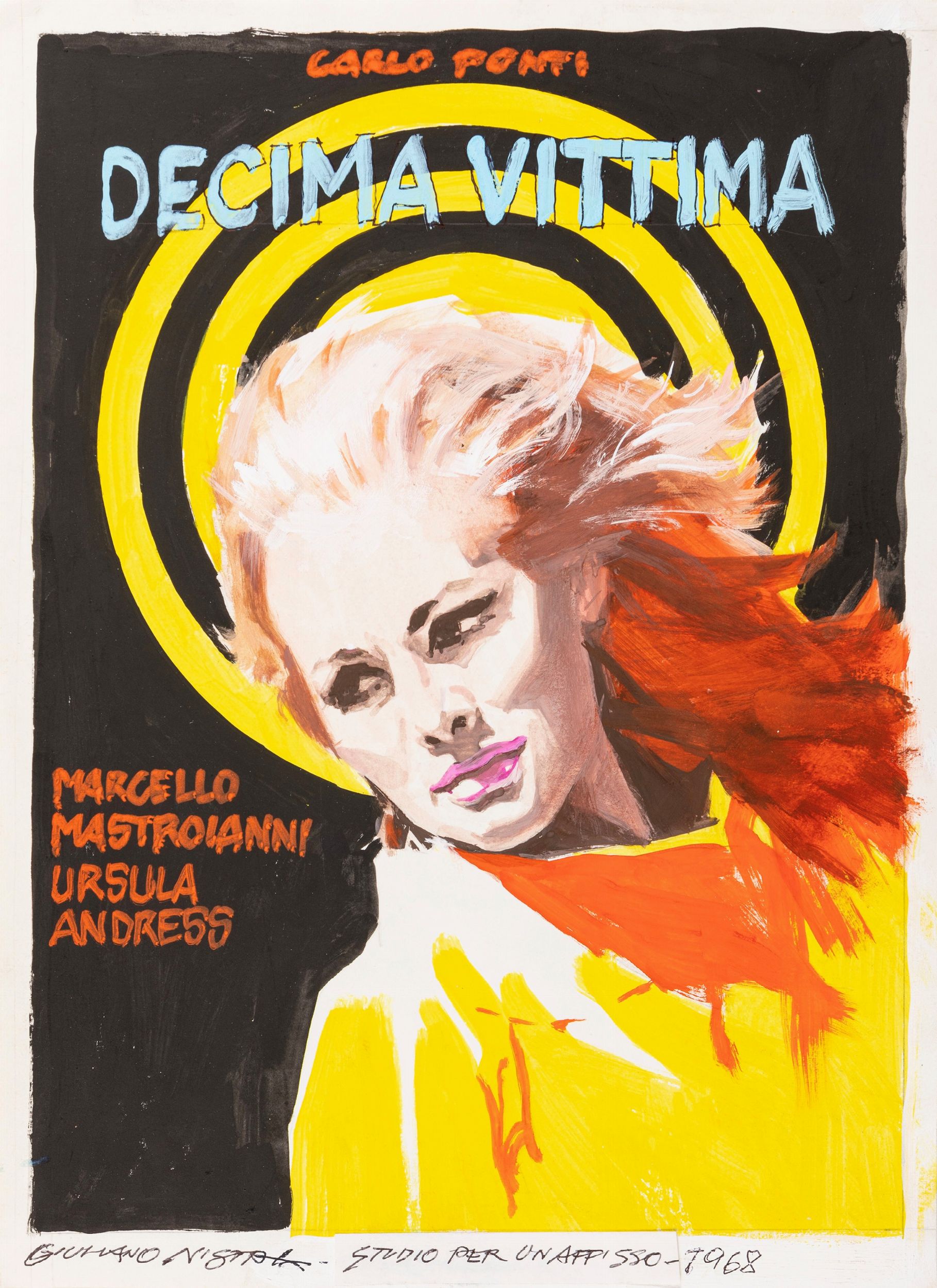 1965 Bozzetto preliminare realizzato da Giuliano Nistri per la locandina ufficiale del film La decima vittima, diretto da Elio Petri con Marcello Mastroianni, Ursula Andress e Elsa Martinelli nel 1965. Firmato.