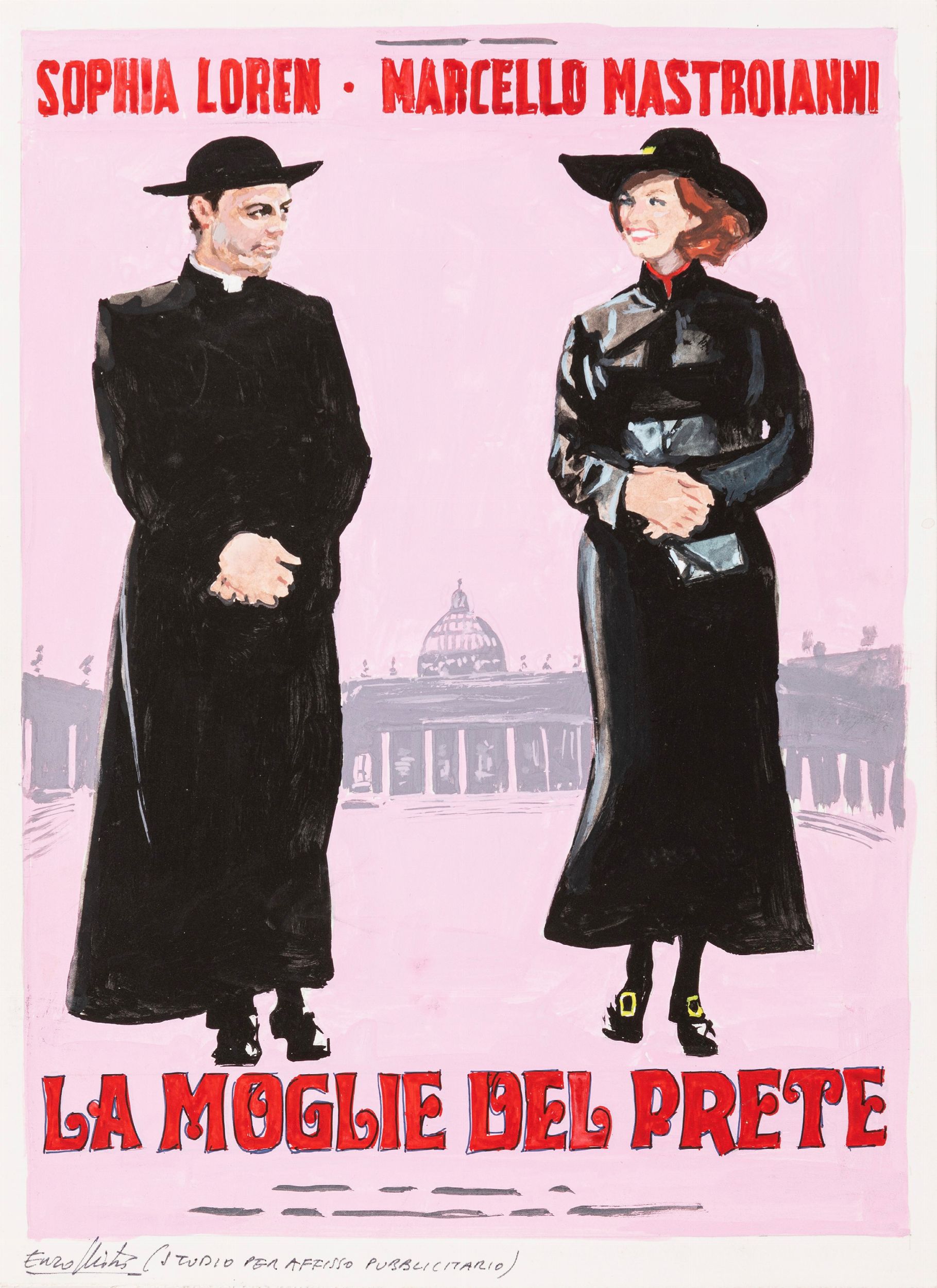 1971 Bozzetto preliminare realizzato da Enzo Nistri per la locandina ufficiale del film La moglie del prete, diretto da Dino Risi con Marcello Mastroianni e Sophia Loren nel 1971. Firmato.