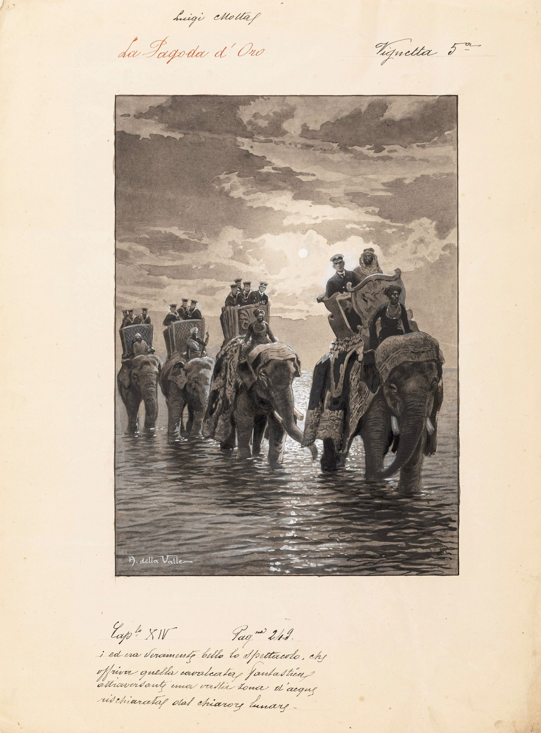 china, acquerello e biacca su cartoncino, 26 x 35,5 cm 1924 Illustrazione originale realizzata da Della Valle per il romanzo La pagoda d'oro di Luigi Motta e Emilio Salgari edito da Bemporad nel 1927. Lievi pieghe e fori di affissione agli angoli. Firmata.