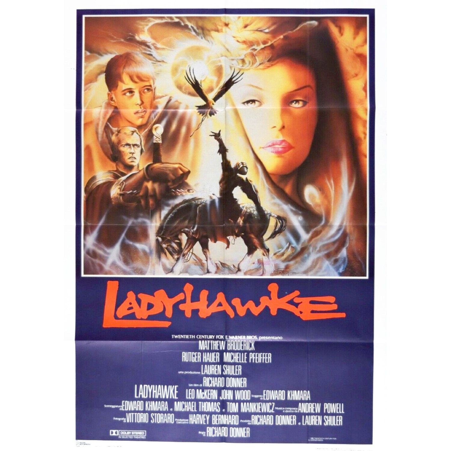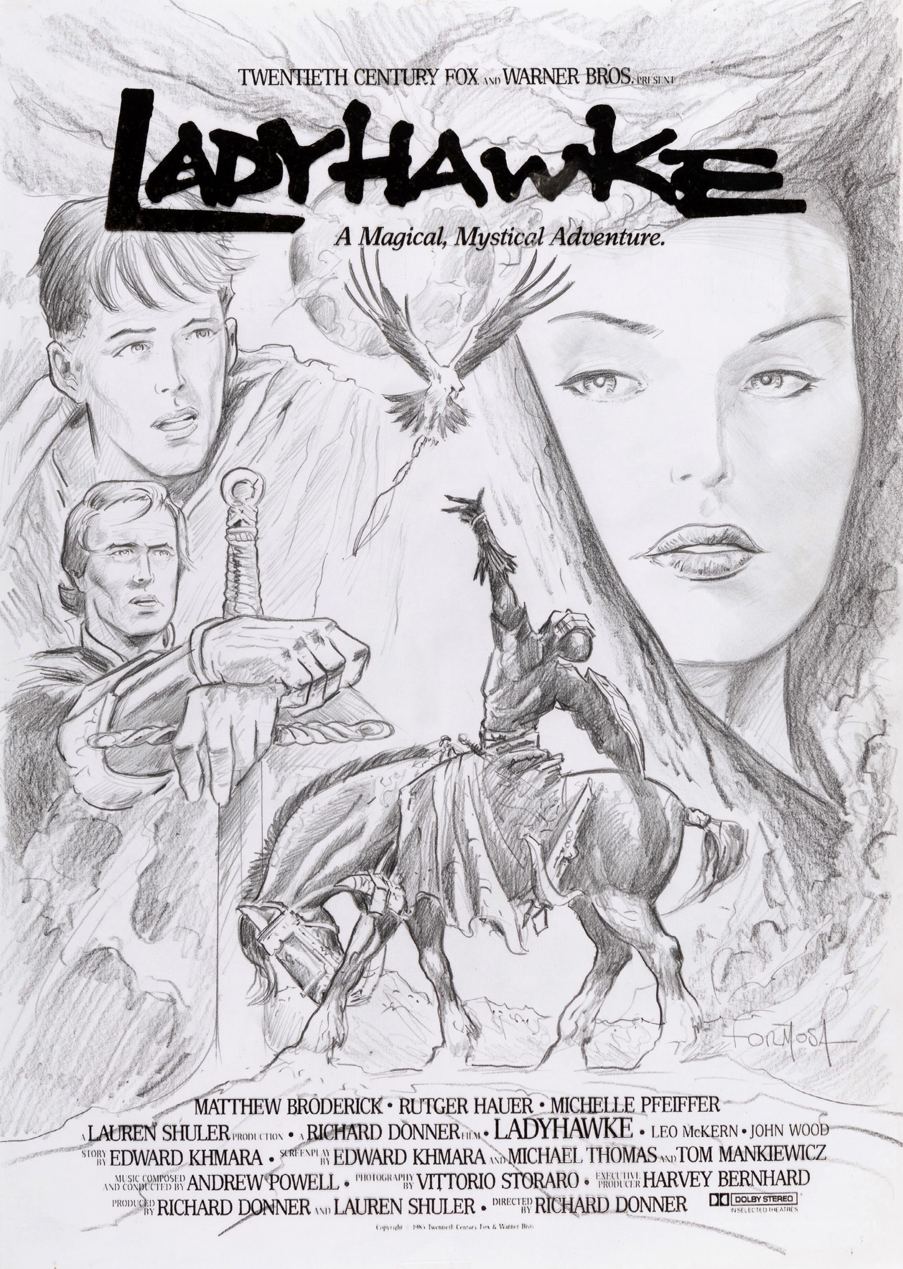 1985 Bozzetto preliminare realizzato da Formosa per la locandina ufficiale del film Ladyhawke, diretto da Richard Donner con Rutger Hauer, Michelle Pfeiffer e Matthew Broderick nel 1985. Firmato.