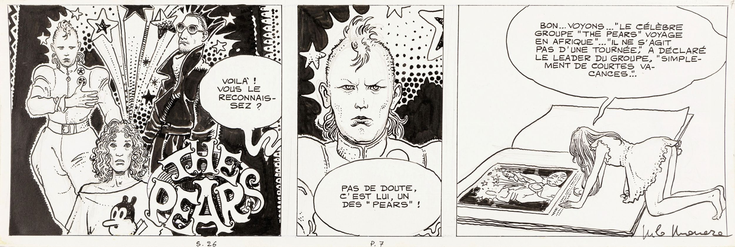 matita e china su cartoncino, 48 x 16,5 cm 1982 Striscia originale realizzata da Manara per il volume Le avventure africane di Giuseppe Bergman edito per la prima volta dalla casa editrice francese Casterman nel 1982. Una strip onirica in cui Manara attraverso il gruppo punk rock The Pears decise di omaggiare i suoi colleghi e amici più visionari: Moebius, Pazienza e Liberatore...non a caso scelse un nome così particolare per questo trio musicale. Firmata.