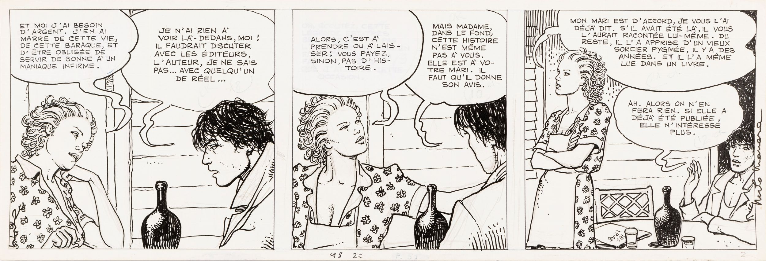 1982 Striscia originale realizzata da Manara per il volume Le avventure africane di Giuseppe Bergman edito per la prima volta dalla casa editrice francese Casterman nel 1982. Firmata.