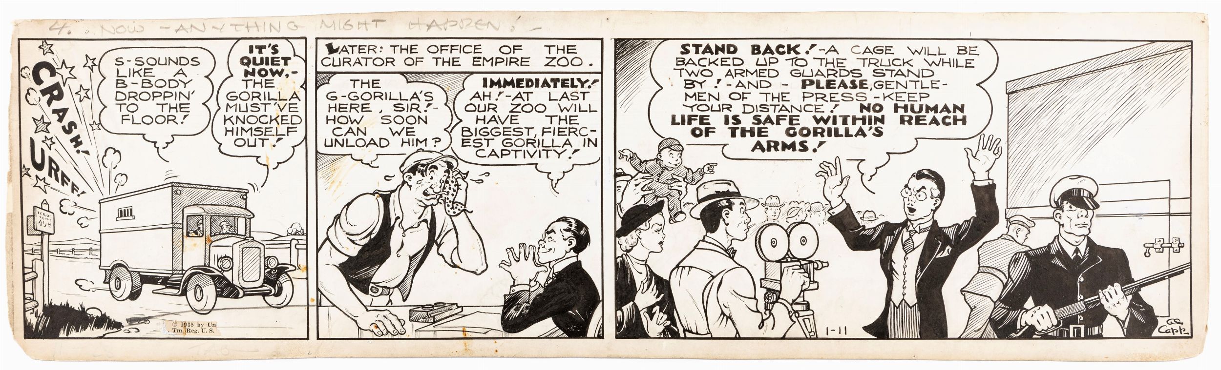 matita e china su cartoncino, 58,5 x 17 cm 11/01/1935 Striscia giornaliera del 11/01/1935 per Li'l Abner. Una rarissima first-year, Lil Abner fu pubblicata ininterrottamente dal 1934 al 1977, grazie al suo humour graffiante che ha per protagonisti gli zotici abitanti della contea di Dogpatch (Arkansas), nelle poverissime montagne del sud-est degli Stati Uniti. Piccole mancanze e fori di affissione ai margini. Firmata e datata.