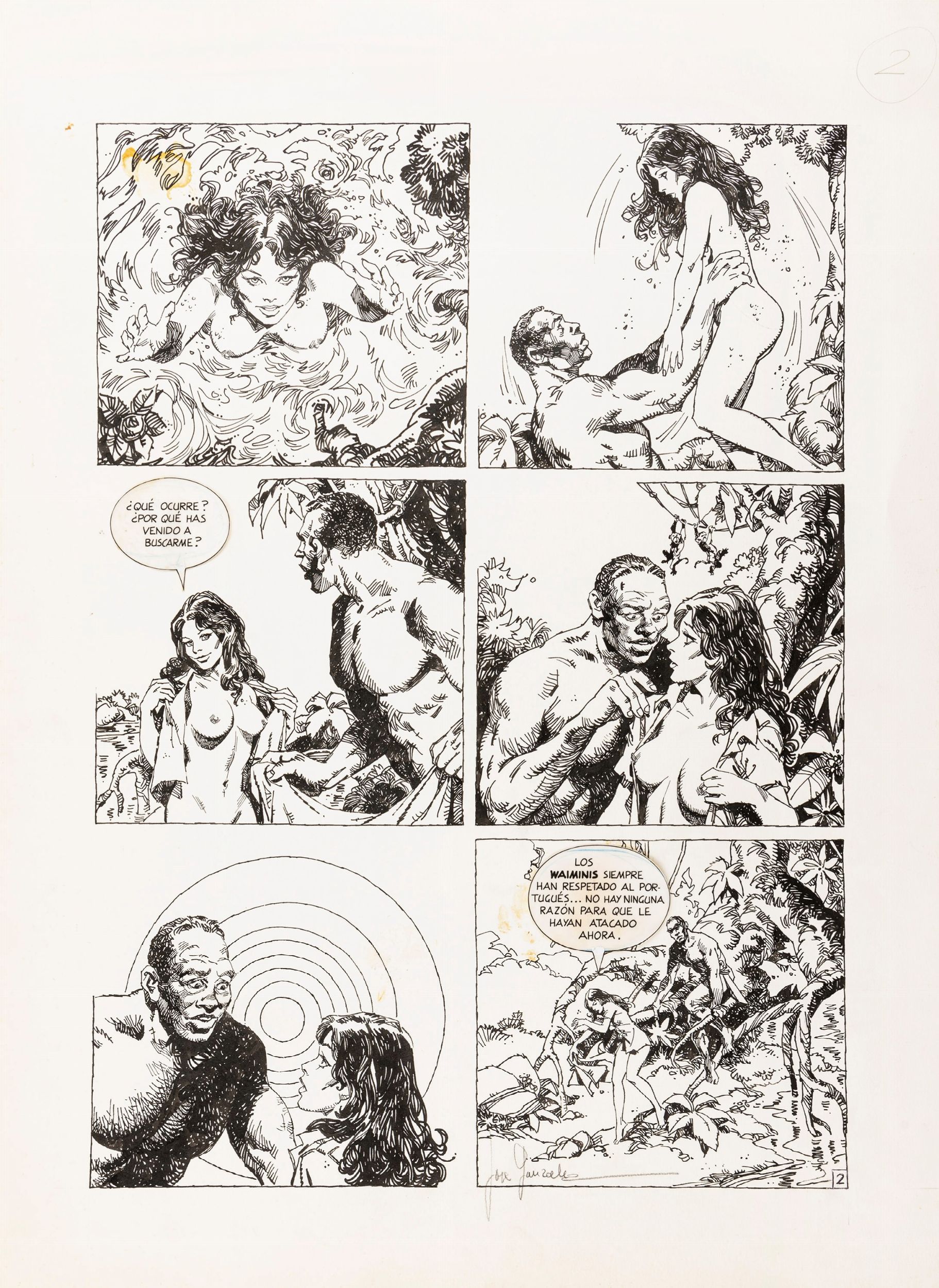 matita e china su cartoncino, 47 x 63 cm 1986 Tavola originale realizzata da Gonzŕlez per prima avventura di Mamba intitolata Una mujer llamada Mamba pag. 2, pubblicata per la prima volta in Spagna sulla rivista Cimoc n. 64 dalla Norma Editorial nel 1986 e successivamente in Italia su Lanciostory Anno XIV n. 2 nel 1988. Firmata.